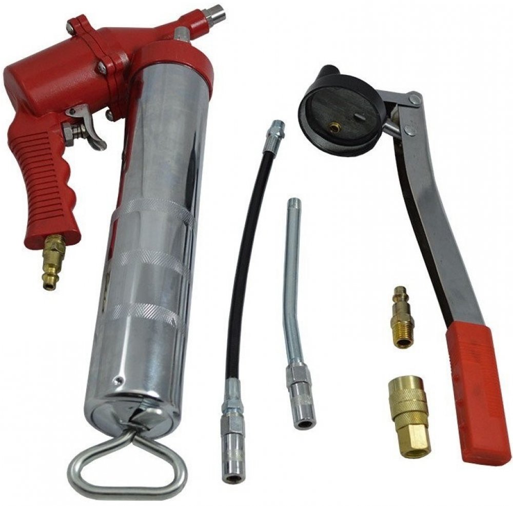 Pneumatická maznice (mazací lis) s adaptérem pro ruční mazání, s příslušenstvím, univerzální – QUATROS QS18018 Mazací lis (označovaný také jako maznice nebo „dekalamitka“) slouží ke vtlačování maziva pod tlakem až 6000 PSI do stavebních strojů, zemědělské techniky, komponentů odpružení, čepů apod. Práce s maznicí je rychlá a efektivní bez plýtvání mazivem a zbytečného nepořádku. Lis má dvojí pohon: mazivo lze vytlačovat pneumaticky připojením k dílenskému kompresoru, nebo ručním tlakováním pákou. Oba adaptéry lze snadno vyměnit přešroubováním. Součástí balení je ohebná hadice s mazací sklíčidlovou spojkou a pevný kovový mazací adaptér (rovněž s mazacím konektorem). Objem nádržky je 500 ml, resp. na standardní 400g kartuš s mazivem. Technické parametry: - vytlačování ručně nebo pneumaticky - tlak mazání až 6000 PSI - pracovní tlak: 4,5-10 bar