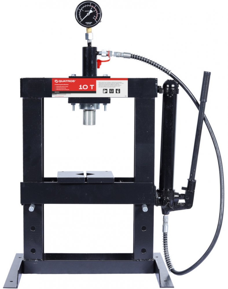 Dílenský lis s hydraulickým pohonem, max. tlak 10 000 kg, výškově nastavitelný pracovní stůl, s manometrem – QUATROS QS19311 Kompaktní lis pro autoservis, dílnu i průmyslový provoz. Používá se např. pro nalisování nebo vylisování částí podvozků, rovnání, tlačení, ohýbání a podobné činnosti. Výšku stolu – pracovní plochy lze snadno nastavit pomocí dvou kovových západek (čepů). Chod lisovacího pístu...