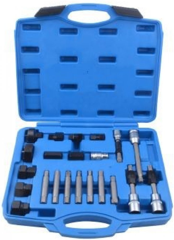 Souprava speciálních klíčů a hlavic (ořechů) sloužících k montáži a demontáži volnoběžných řemenic z alternátorů různých značek a typů (Bosch, Valeo, Volkswagen, Audi, Škoda, Seat, BMW, Fiat, Ford, Mercedes, Renault a další).