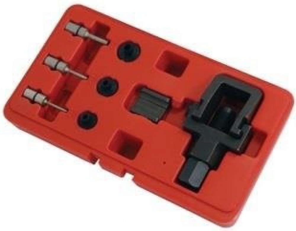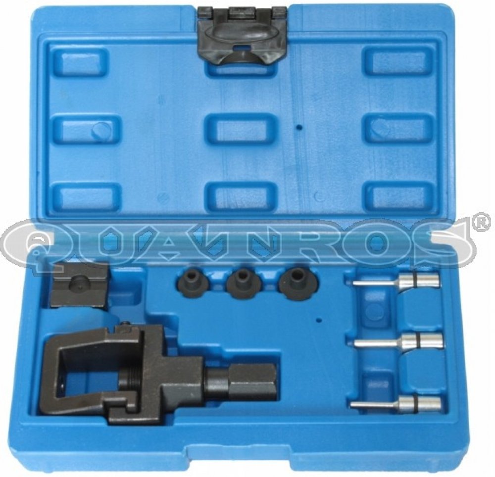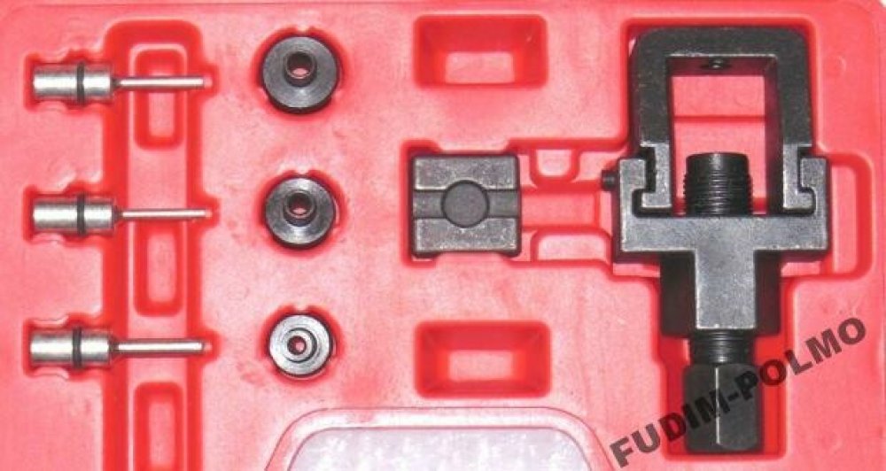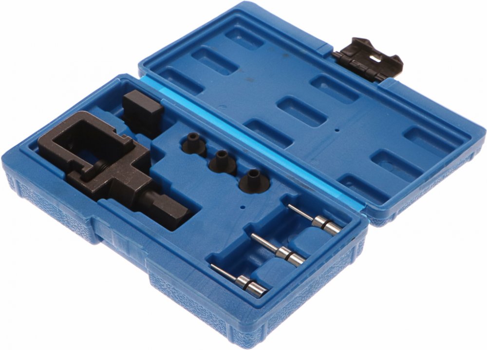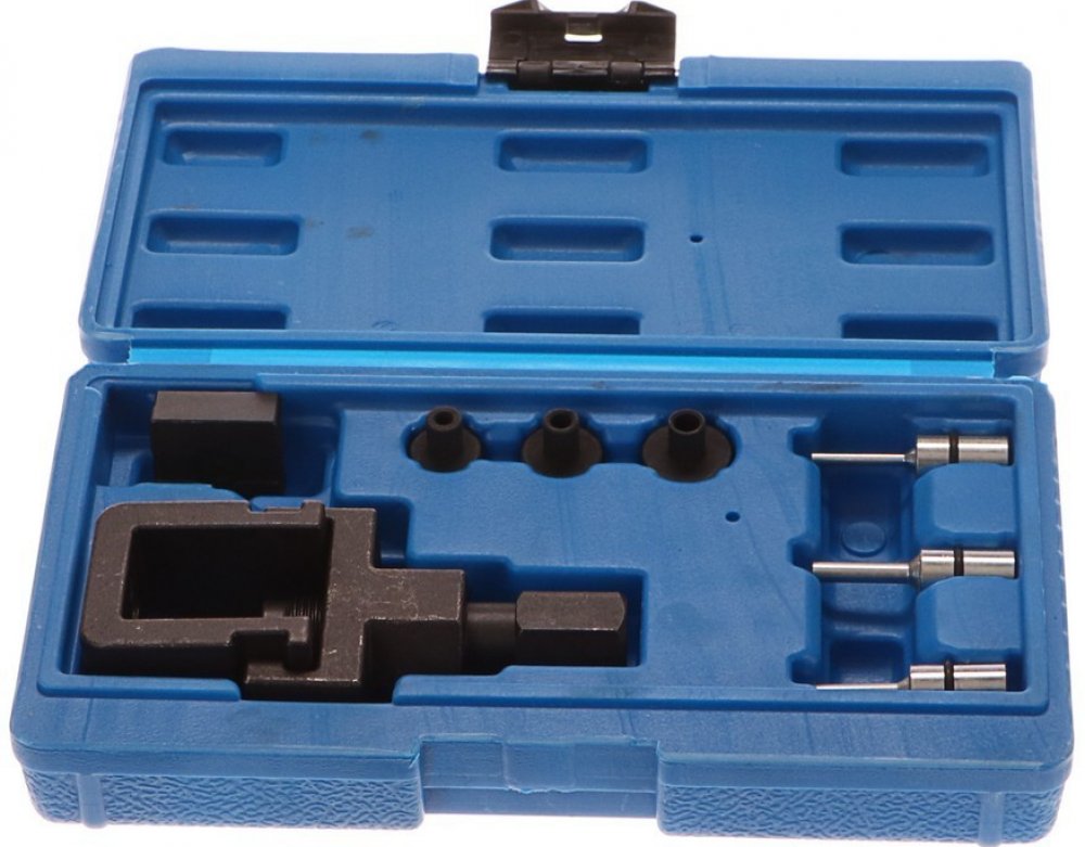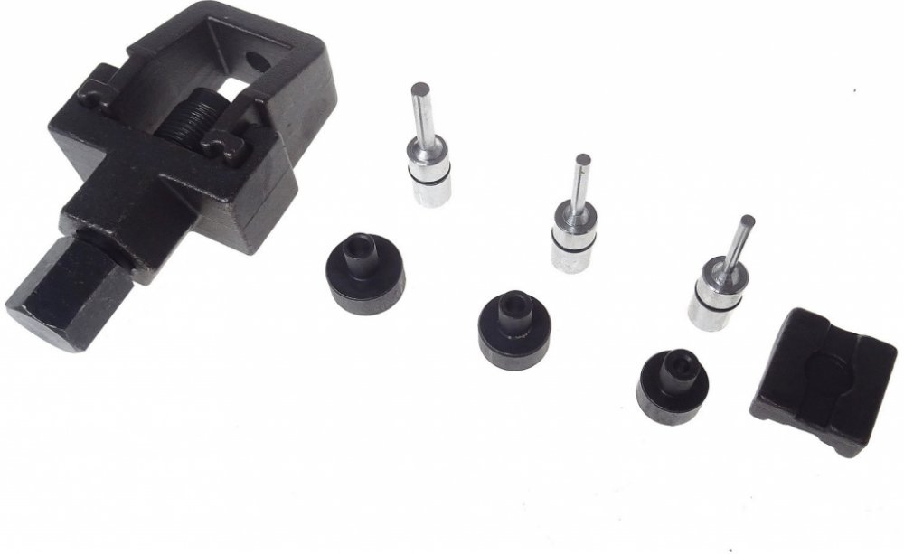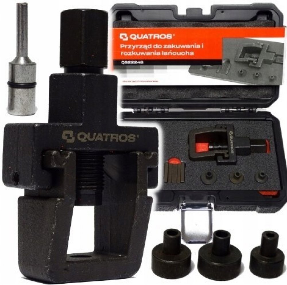 Sada pro nýtování motocyklových řetězů, čtyřdílná, plastové pouzdro, 8dílná – QUATROS QS22248 Univerzální nýtovačka na demontáž a montáž řetězů z motocyklů. Vhodná pro velikosti 520, 525, 530, 532 a 630. Nástroj může být zajištěn pomocí svěráku, nebo klíče (19 a 27 mm). Před každým použitím je vhodné zkontrolovat závit a namazat jej pro snazší nýtování. Mazivo zároveň chrání závity proti poškození...
