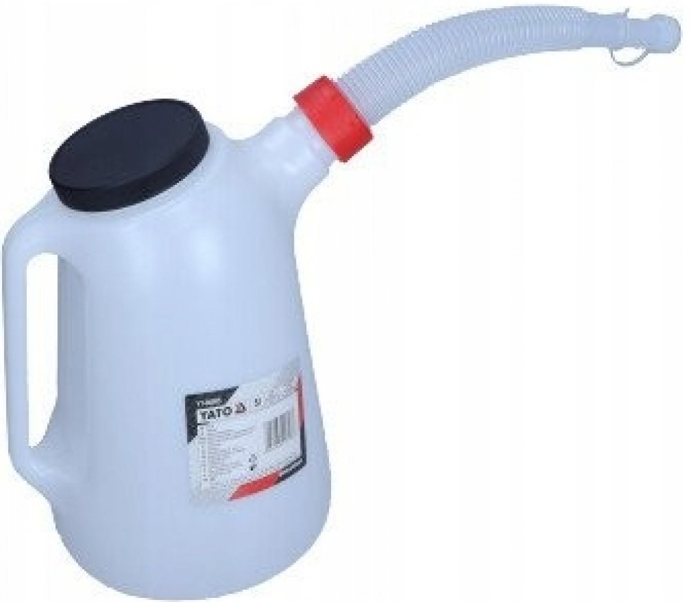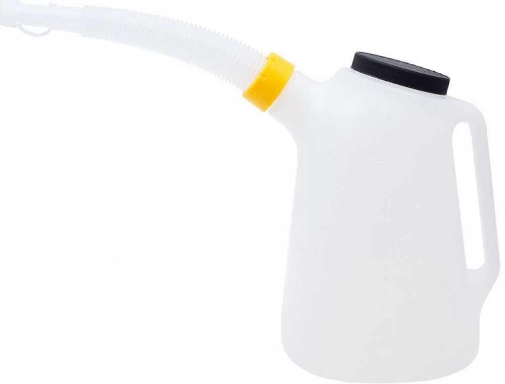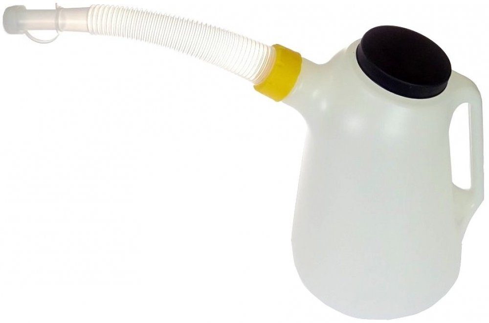 průsvitný plast, ohebná hubice ve tvaru husího krku, uzavíratelné víčko, měrná stupnice, objem 5 litrů, snadné nalévání do těžko přístupných míst