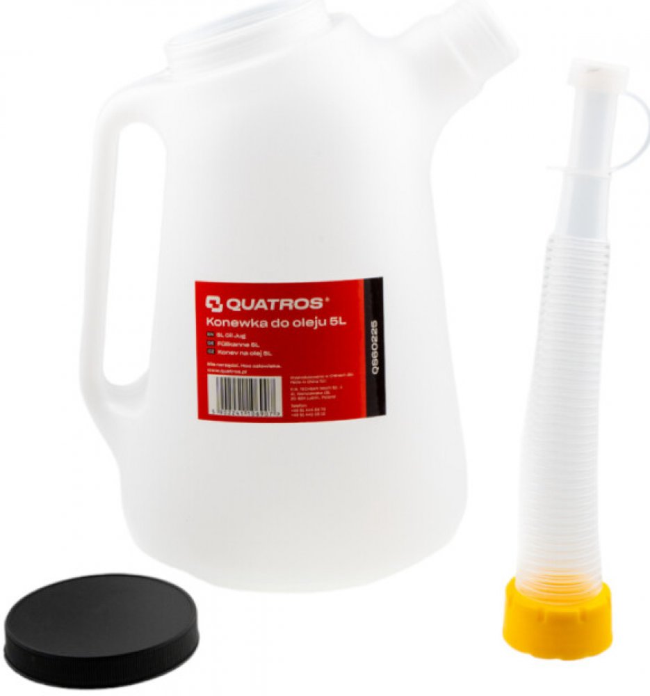 QUATROS Nádoba na olej 5l, konev s hubicí QS60225 Nádoba slouží k přesnému a čistému nalévání motorového oleje a provozních kapalin do vozidel. Výrobek QUATROS je vybaven praktickou ohebnou hubicí pro snadné použití i v těžko přístupných místech. Popis p...