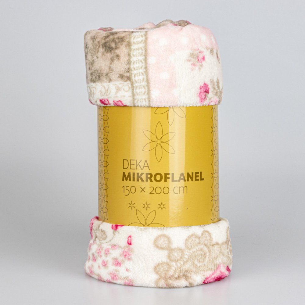 Deka z mikroflanelu (100% polyester) s motivem patchworku v jemných růžových barvách. Přikrývka je z každé strany jiná. Z jedné strany je deka s potiskem, z druhé strany je deka bez potisku s chloupkem. Deka je v rozměru na jednolůžko 150 x 200 cm.