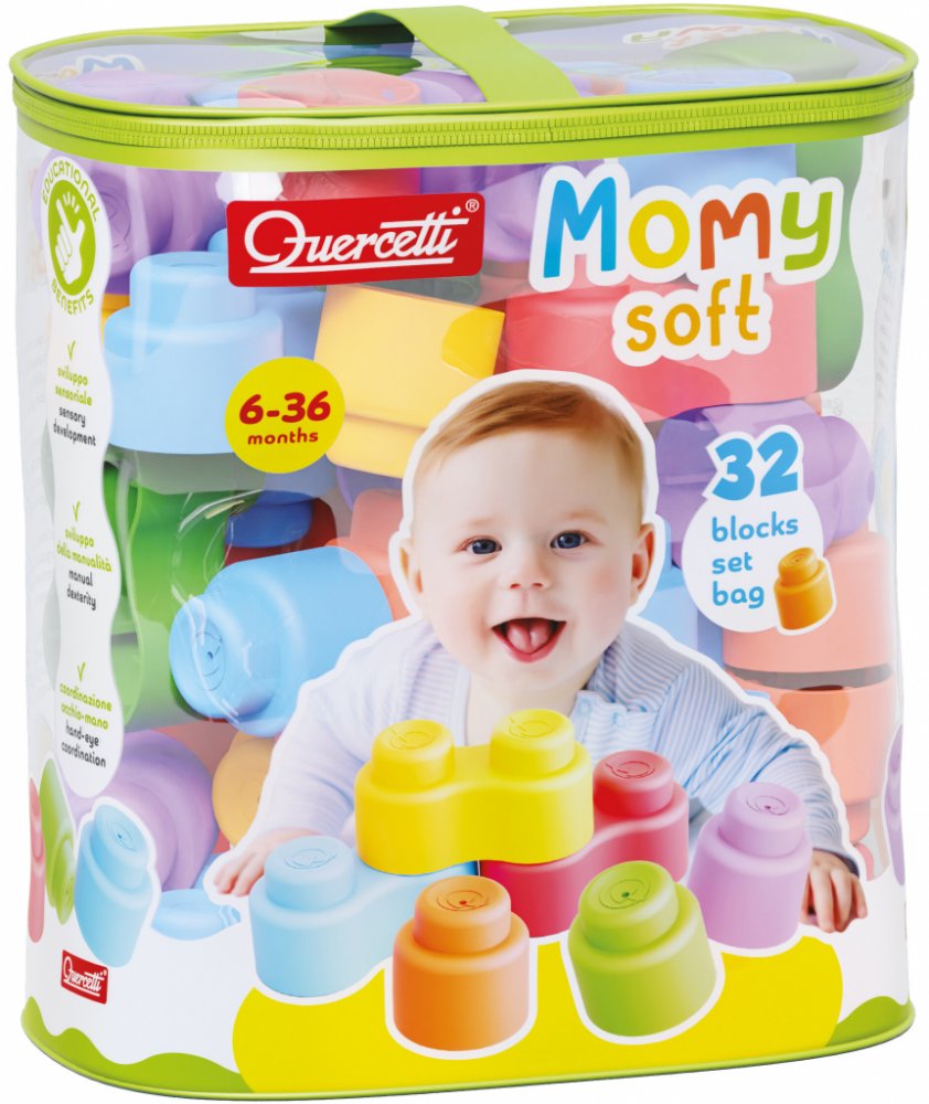Quercetti 04143 Momy Soft Bag, Momy Soft Bag je stavebnice o 32 dílech určená nejmenším dětem. Živé barvy, zaoblené tvary a snadné napojování nabízí nekonečné kombinace a zaručenou zábavu. Měkký materiál je příjemný na dotek a dobře se s ním manipuluje. Stavebnice rozvíjí u dětí manuální zručnost, jemnou motoriku a koordinaci ruka-oko.