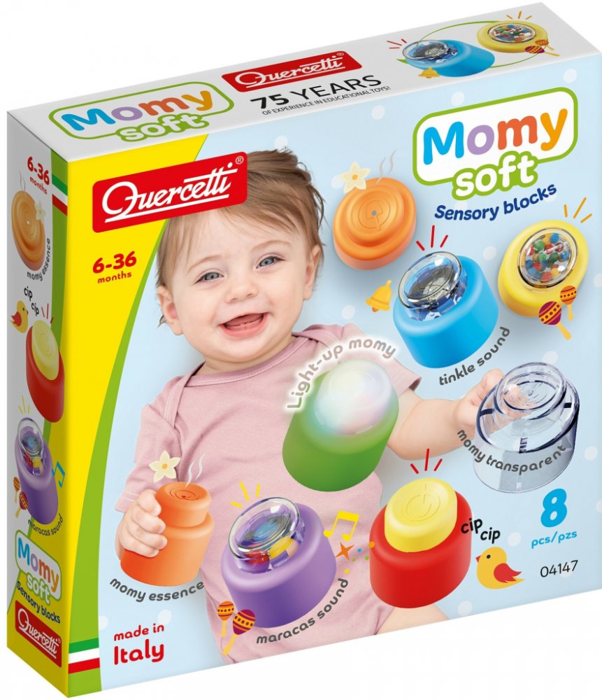 Quercetti 04147 Momy Soft Sensory Blocks, Měkké senzorické bloky Momy jsou navrženy tak, aby dětem nabídly poutavý a vývojově bohatý herní zážitek. Tato sada je vhodná pro děti ve věku 6 až 36 měsíců a obsahuje 8 velkých měkkých bloků, z nichž každý má jedinečné senzorické vlastnosti, které podporují objevování prostřednictvím hmatu, zvuku a vizuální stimulace.