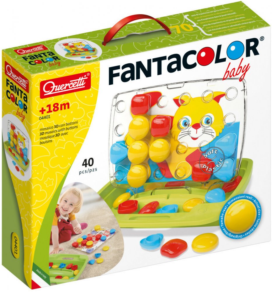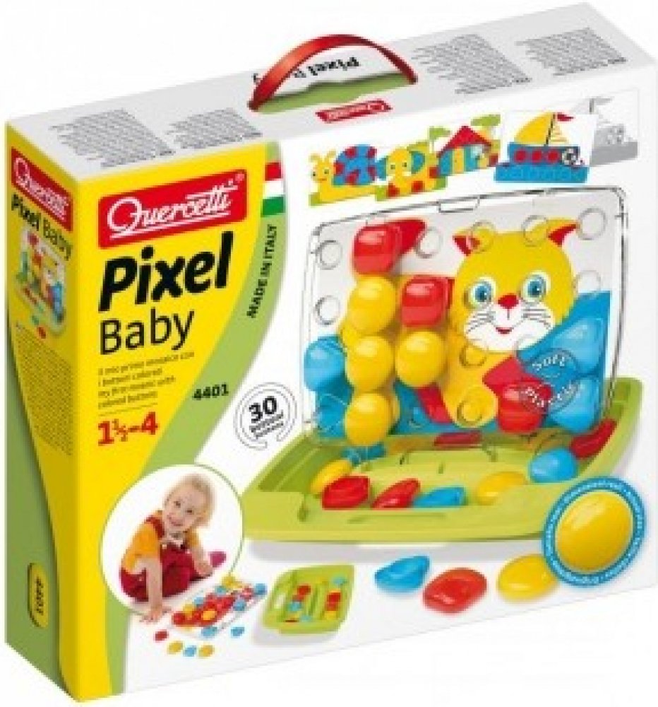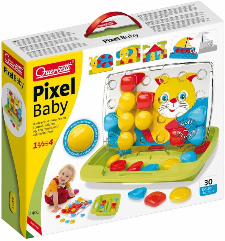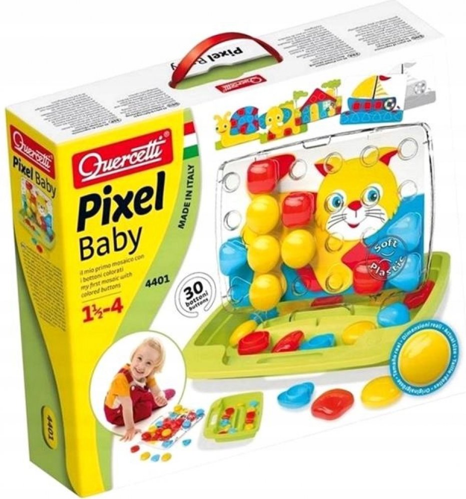 ♥ Quercetti Pixel Baby Plug-in Mosaic Cat ♥Vlastnosti produktu:- Vnější povrchová úprava, která je součástí balení:✔️stimuliert rozpoznávání barev✔️ rozvíjí manuální dovednosti a motorickou koordinaci Mozaika umožňuje skvělou a kreativní zábavu při vytváření mozaiky vkládáním kolíčků do děrované destičky podle navrženého vzoru nebo vlastní fantazie. Hračka stimuluje rozpoznávání barev, podporuje manuální zručnost a motorickou koordinaci. Všechny prvky jsou vyrobeny z vysoce kvalitního plastu, jsou ohebné a mají bezpečné zaoblené hrany. Sada se skládá z tužek o průměru 46 mm, 8 kartiček se vzory z kartonu a pouzdra, které se po otevření stane stojánkem a deskou. Hračka byla vyrobena v Itálii. Součástí nákupu je oboustranné puzzle se zvířátky. Mozaika pro nejmladší děti. Obsahuje 30 velkých knoflíků ve třech různých barvách a tvarech, 8 vzorových oboustranných karet a transparentní desku s otvory v inovovaném designu s rukojetí pro snadné přenášení. Doporučený věk 1,5-4 roky. Součástí hry je rovněž praktický kufřík. FantaColor Baby je mozaika s barevnými kolíky ve 3 různých barvách a 3 různých tvarech. Děti by měly jednoduše zasunout barevné špunty do správných otvorů v průhledné desce a dát dohromady mozaiky, které drží na svém místě. Mozaikové šablony, které nejlepším způsobem podporují zrakové vnímání dětí, se umístí na zadní stranu desky. Pouzdro s držadlem je dokonalým a elegantním řešením pro přenášení, kdy sbalíte všechny herní prvky a vezmete je s sebou kamkoli jdete. Obsah balení: 8 obrázkových karet 30 XL kolíčků (ø 46 mm) ve 3 tvarech a 3 barvách Přenosné pouzdro Transparentní podložka