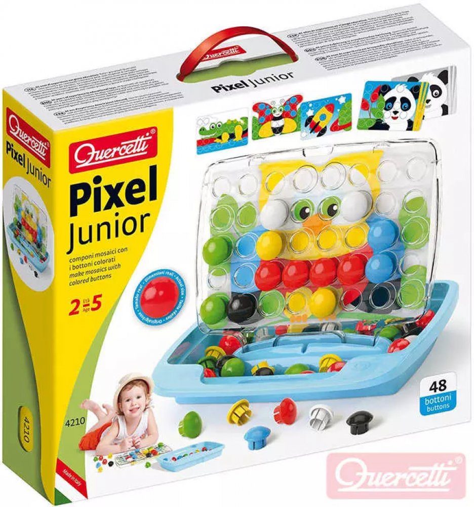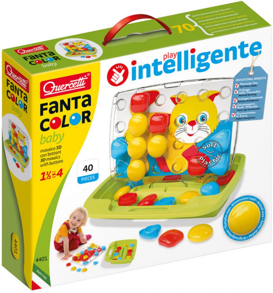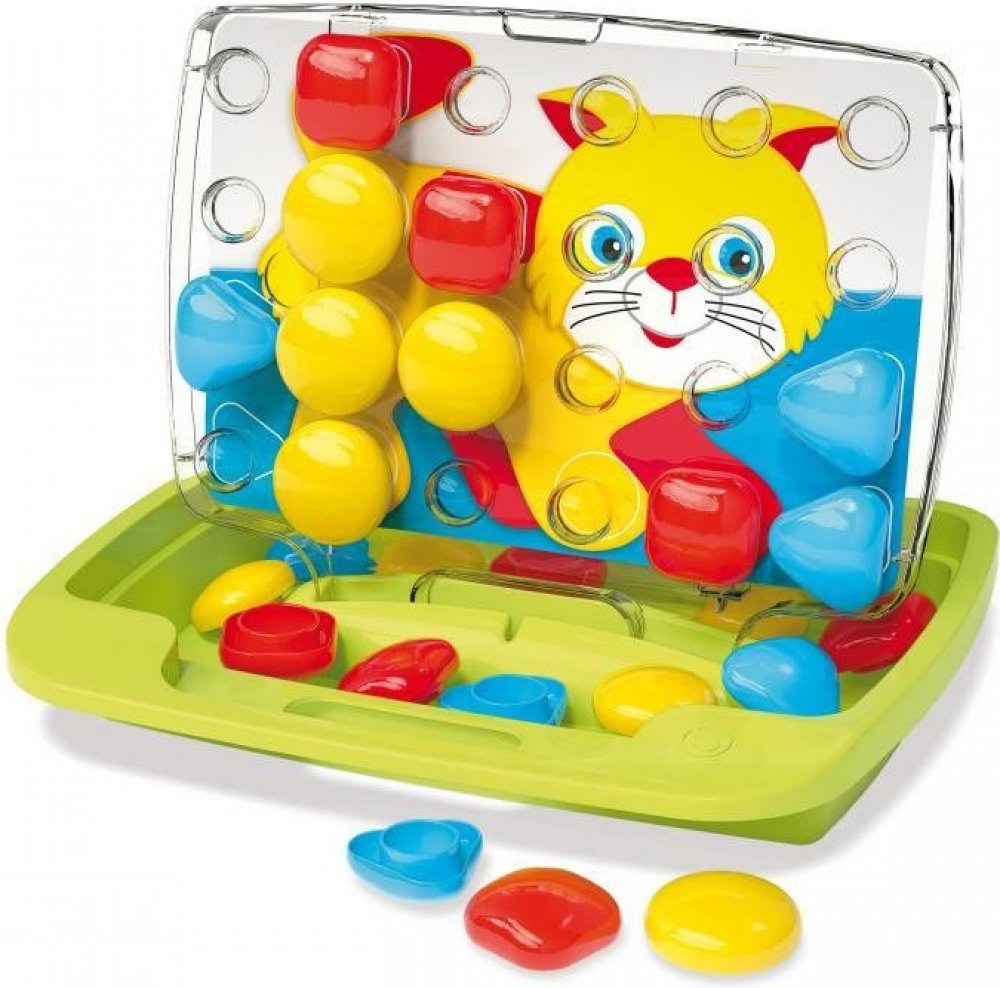 ♥ Quercetti Pixel Baby Plug-in Mosaic Cat ♥Vlastnosti produktu:- Vnější povrchová úprava, která je součástí balení:✔️stimuliert rozpoznávání barev✔️ rozvíjí manuální dovednosti a motorickou koordinaci Mozaika umožňuje skvělou a kreativní zábavu při vytváření mozaiky vkládáním kolíčků do děrované destičky podle navrženého vzoru nebo vlastní fantazie. Hračka stimuluje rozpoznávání barev, podporuje manuální zručnost a motorickou koordinaci. Všechny prvky jsou vyrobeny z vysoce kvalitního plastu, jsou ohebné a mají bezpečné zaoblené hrany. Sada se skládá z tužek o průměru 46 mm, 8 kartiček se vzory z kartonu a pouzdra, které se po otevření stane stojánkem a deskou. Hračka byla vyrobena v Itálii. Součástí nákupu je oboustranné puzzle se zvířátky. Mozaika pro nejmladší děti. Obsahuje 30 velkých knoflíků ve třech různých barvách a tvarech, 8 vzorových oboustranných karet a transparentní desku s otvory v inovovaném designu s rukojetí pro snadné přenášení. Doporučený věk 1,5-4 roky. Součástí hry je rovněž praktický kufřík. FantaColor Baby je mozaika s barevnými kolíky ve 3 různých barvách a 3 různých tvarech. Děti by měly jednoduše zasunout barevné špunty do správných otvorů v průhledné desce a dát dohromady mozaiky, které drží na svém místě. Mozaikové šablony, které nejlepším způsobem podporují zrakové vnímání dětí, se umístí na zadní stranu desky. Pouzdro s držadlem je dokonalým a elegantním řešením pro přenášení, kdy sbalíte všechny herní prvky a vezmete je s sebou kamkoli jdete. Obsah balení: 8 obrázkových karet 30 XL kolíčků (ø 46 mm) ve 3 tvarech a 3 barvách Přenosné pouzdro Transparentní podložka