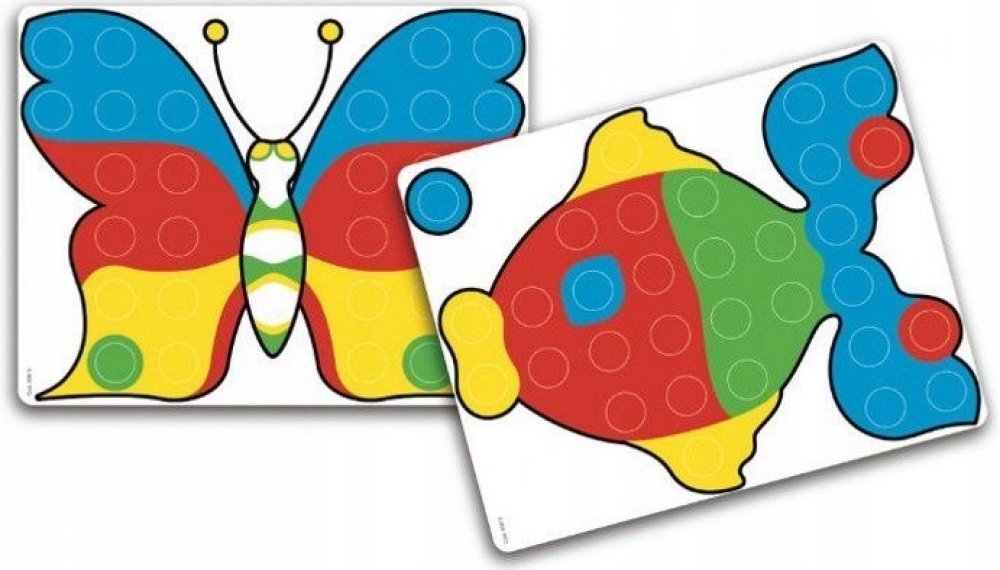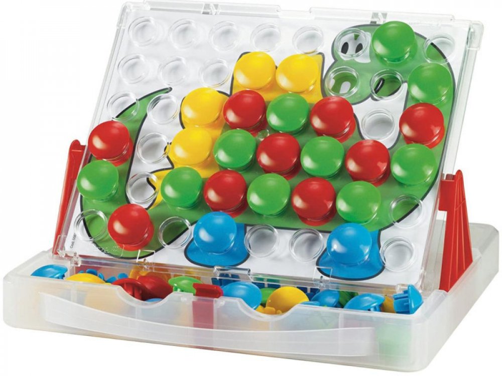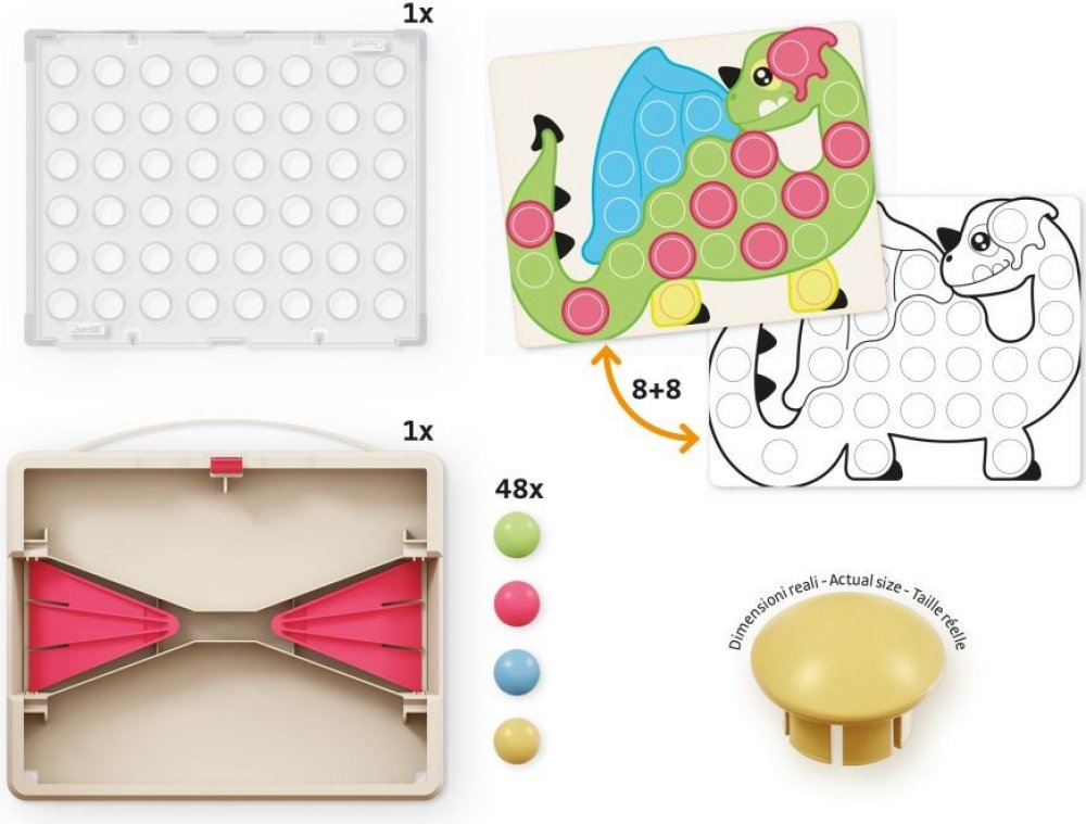Mozaiky určené dětem již od 2 let rozvíjejí vizuomotorickou koordinaci, jemnou motoriku a tvořivé myšlení. Balení obsahuje 48 velkých nerozbitných knoflíků o průměru 32 mm, průhlednou desku s otvory, pod kterou lze snadno vložit jednu z 8 oboustranných karet s 16 předlohami (barevné nebo černobílé obrázky), a stojánek (4195) nebo kufřík (4190), který zároveň plní funkci stojánku, a umožňuje tak us...