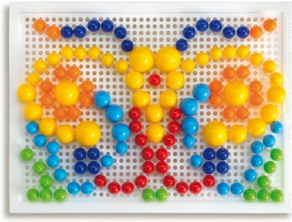 Mozaiky u dětí rozvíjí jemnou motoriku, tvořivost a fantazii. Skládají se z kufříku, perforované hrací desky a barevných kolíčků s hlavičkami různých barev, průměrů a tvarů. Pomocí těchto kolíčků, které se zasazují do otvorů v hrací desce, tvoří děti různé obrázky nebo vzory. Po skončení hry lze vše uložit do kufříku, jehož víko po zajištění pojistkou tvoří sama hrací deska. Vyrobeno z plastů špič...