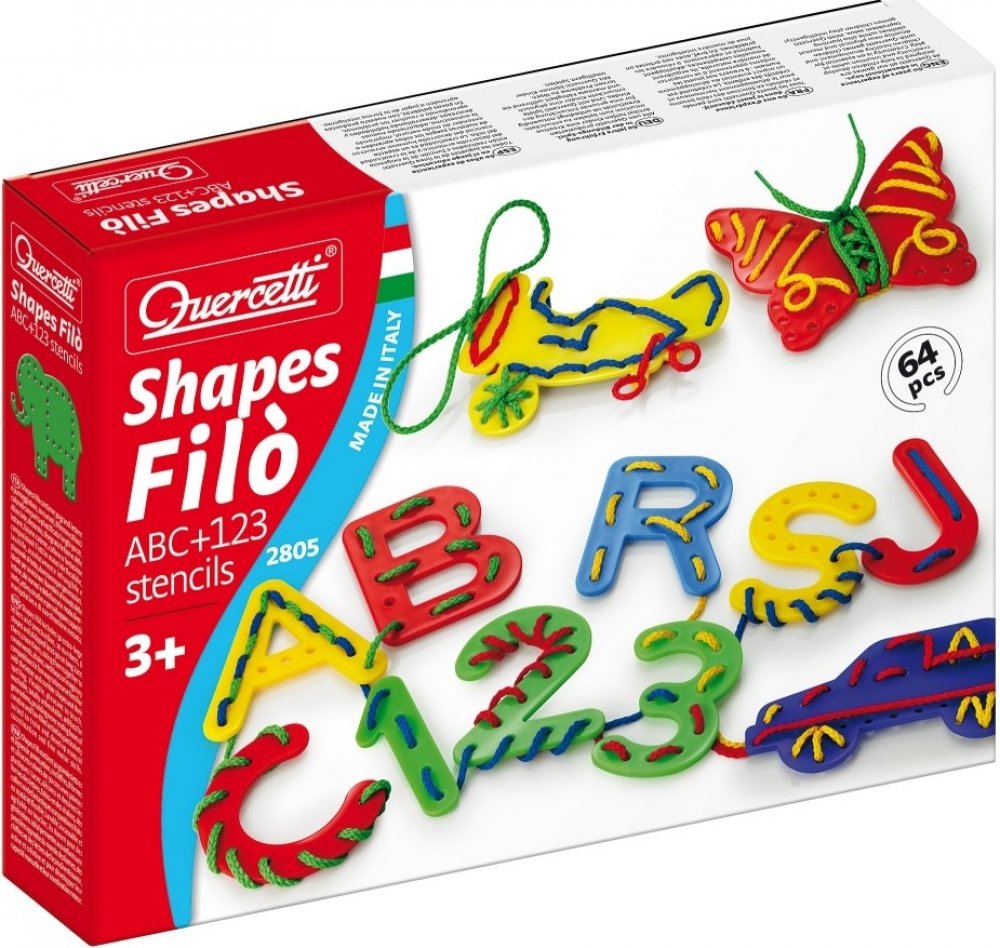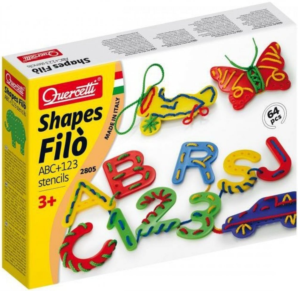 Shapes Filó obsahuje 30 obzvlášť velikých písmen a interpunkčních znamének, 10 číslic, 8 tvarů a 16 barevných šňůrek se zpevněnými konci dlouhých 90 cm. Protahujte je, obkreslujte, svazujte je k sobě a vytvářejte slova, řetězy, náhrdelníky či různé fantastické kompozice! Zábavný způsob, jak se seznámit se světem písmen a číslic. Všechny dílky jsou ohebné, příjemné na dotek, omyvatelné a zcela nerozbitné, díky čemuž zajistí mnoha generacím dětí nekonečné hodiny tvůrčí zábavy užitečné zejména pro procvičování a rozvoj zručnosti a jemné motoriky. Určeno dětem od 3 let.