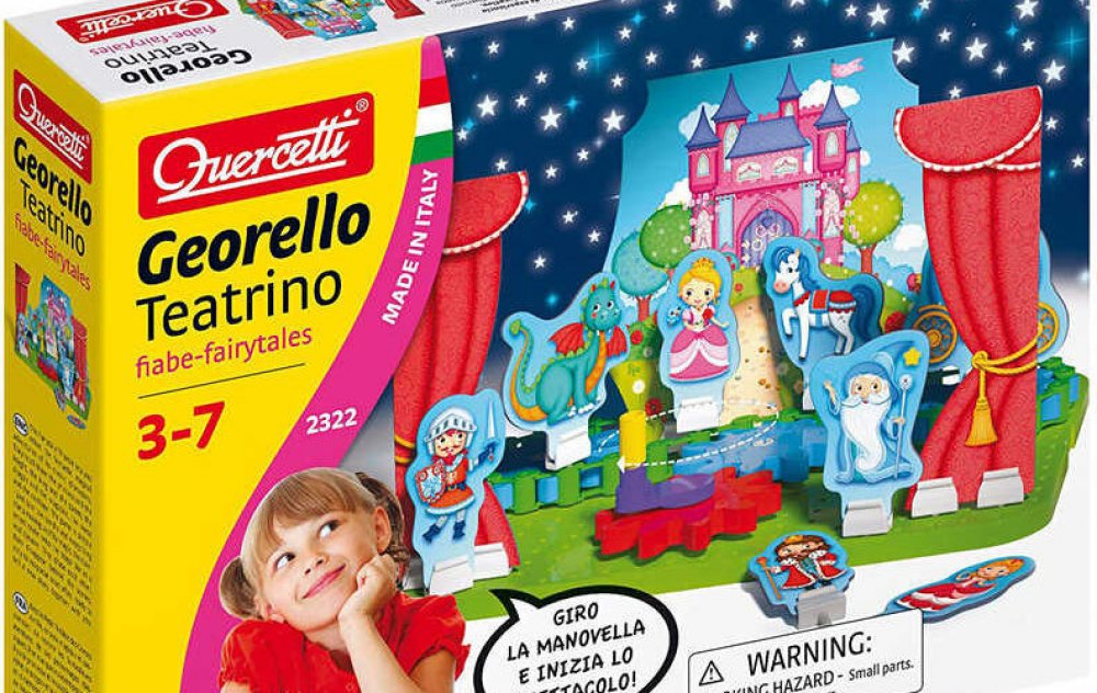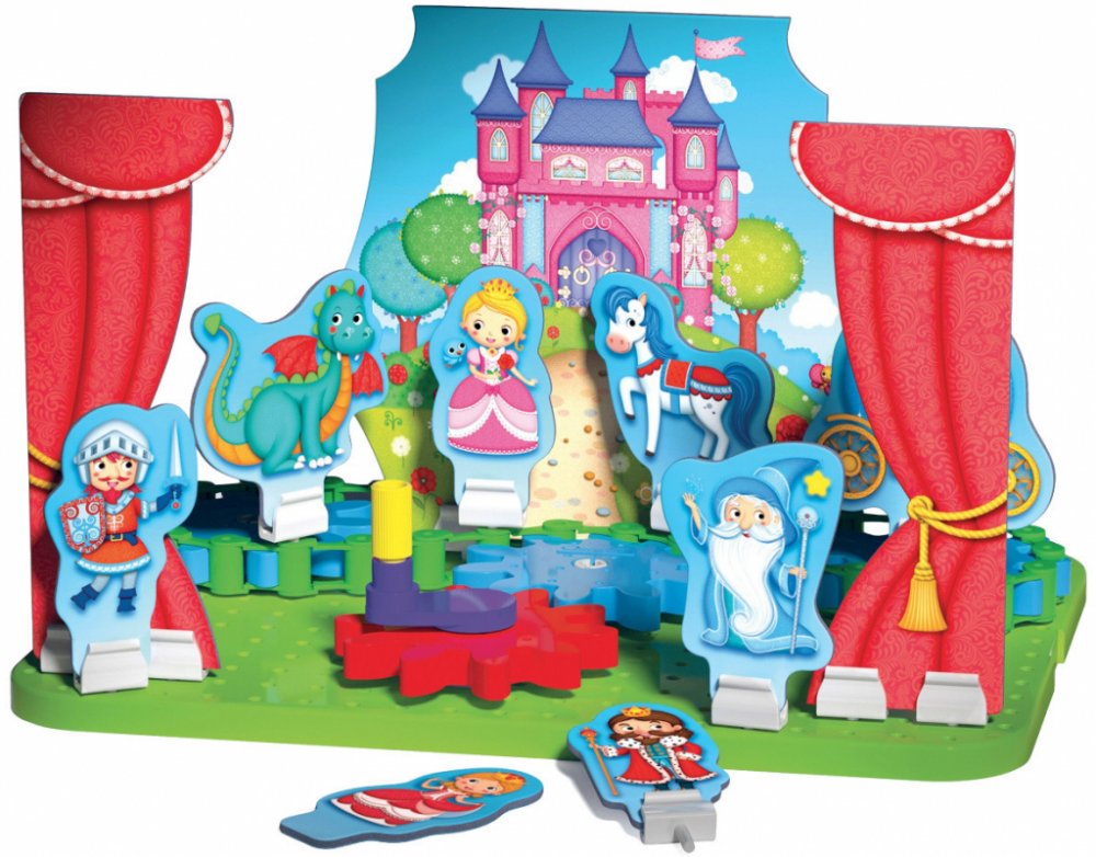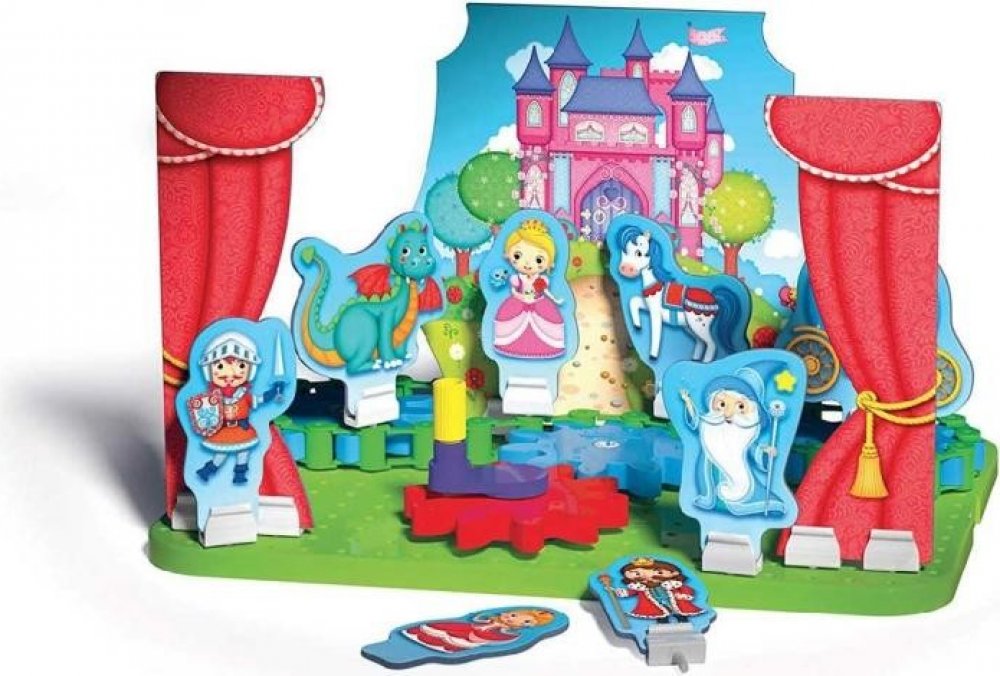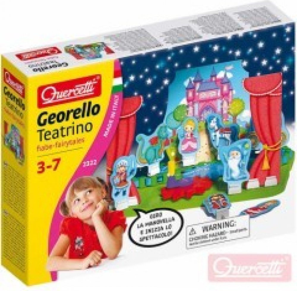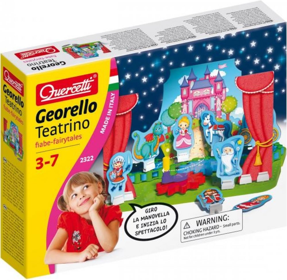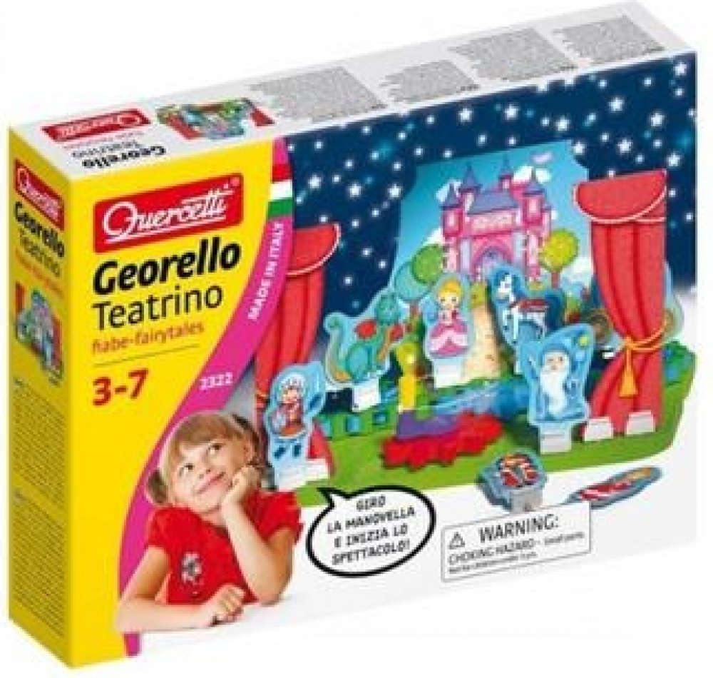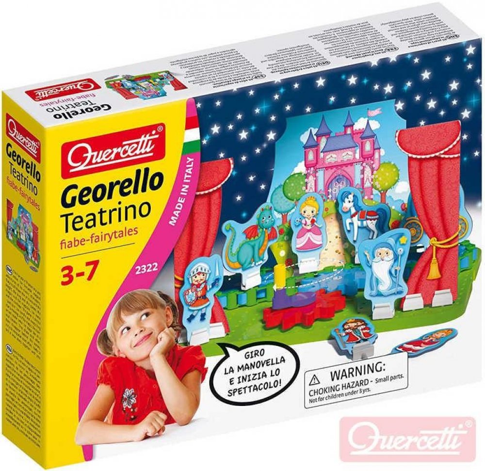 Divadelní pohádkové georello kombinuje převodovou stavebnici se světem plným pohádkových postav, jako je král a královna, princezna, rytíř, drak nebo čaroděj. Nechybí ani kůň táhnoucí královský kočár. Otočte kouzelnou klikou a postavičky se začnou prohánět na jevišti jako ve skutečném divadle.