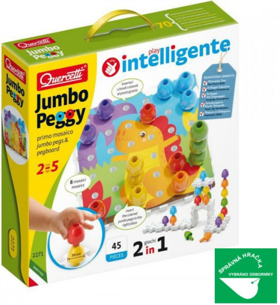 Quercetti 02271_PO Jumbo Peggy, Stačí však odložit obrázky stranou a podložky s kolíčky se rázem promění v originální stavebnici, díky níž lze stavět vysoké věže či jiné konstrukce dle vlastní fantazie. Skvělá souprava tak vlastně v jednom balení přináší dvě hry, které u dětí od 2 do 5 let procvičují a rozvíjejí jemnou motoriku i koordinaci ruky a oka a zároveň podporují jejich kognitivní i jazyko...