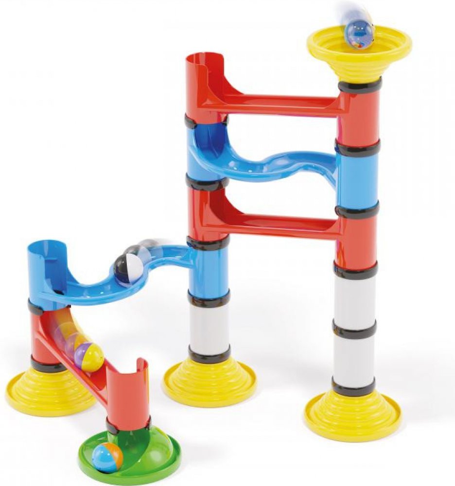 Quercetti 06506_PO Migoga Junior Intermediate, Díky stavebnici Migoga Junior si i menší děti mohou hrát s kuličkovou dráhou, která byla vytvořena speciálně pro ně. Všechny díly stavebnice jsou veliké a mají různé barvy, aby se daly od sebe snadno rozeznat. Spojení jsou snadná a intuitivní, což umožňuje rychle postavit různé dráhy. Kuličky mají průměr 4,5 cm a některé při pohybu chrastí. Jsou navrž...