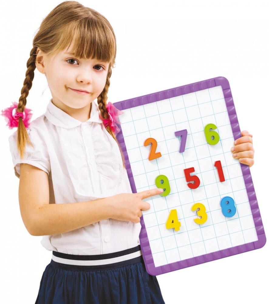 Sada obsahuje magnetickou tabuli, písmena, čísla a obrázky. Jedna strana kufříku je jedinečná tabule, na kterou můžete kreslit obrázky speciálními fixy, a druhá strana je magnetická tabule, na kterou můžete nalepit písmena, čísla a obrázky. Hračka rozvíjí koordinaci očí a rukou, učí soustředění, kreativnímu myšlení.Obsah: oboustranná tabule, 48 písmen, 48 čísel, 22 magnetických karet, 1 fix, 1 gum...