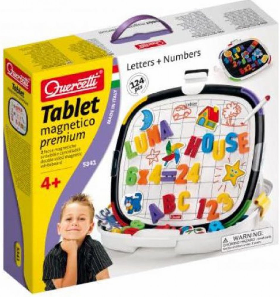 Sada obsahuje magnetickou tabuli, písmena, čísla a obrázky. Jedna strana kufříku je jedinečná tabule, na kterou můžete kreslit obrázky speciálními fixy, a druhá strana je magnetická tabule, na kterou můžete nalepit písmena, čísla a obrázky. Hračka rozvíjí koordinaci očí a rukou, učí soustředění, kreativnímu myšlení.Obsah: oboustranná tabule, 48 písmen, 48 čísel, 22 magnetických karet, 1 fix, 1 guma, 2 podpěry, kufřík na přenášení Dvojitá magnetická tabulka se stíratelným fixem, magnetickými číslicemi, 48 písmeny a 48 číslicemi. Vhodné pro děti od 5 let ideální pro procvičování prvních slov a matematiky Tablica magnetyczna dwustronna Premium Magnetické tabulky Quercetti s písmeny a číslicemi