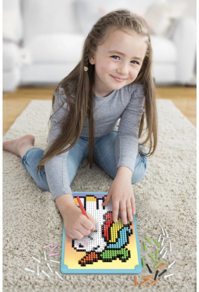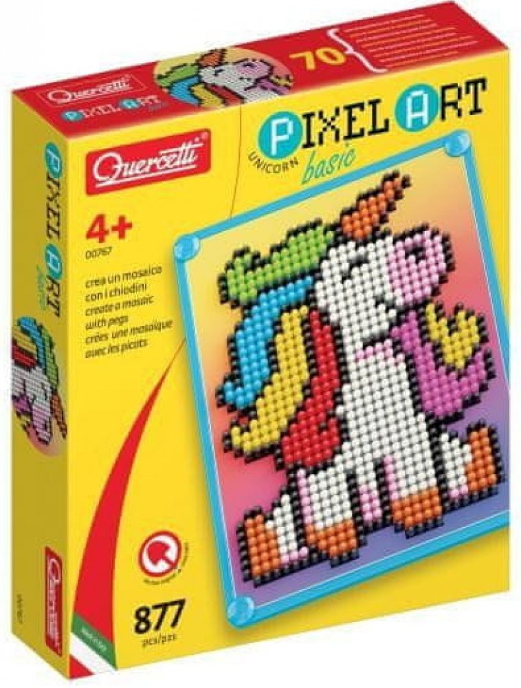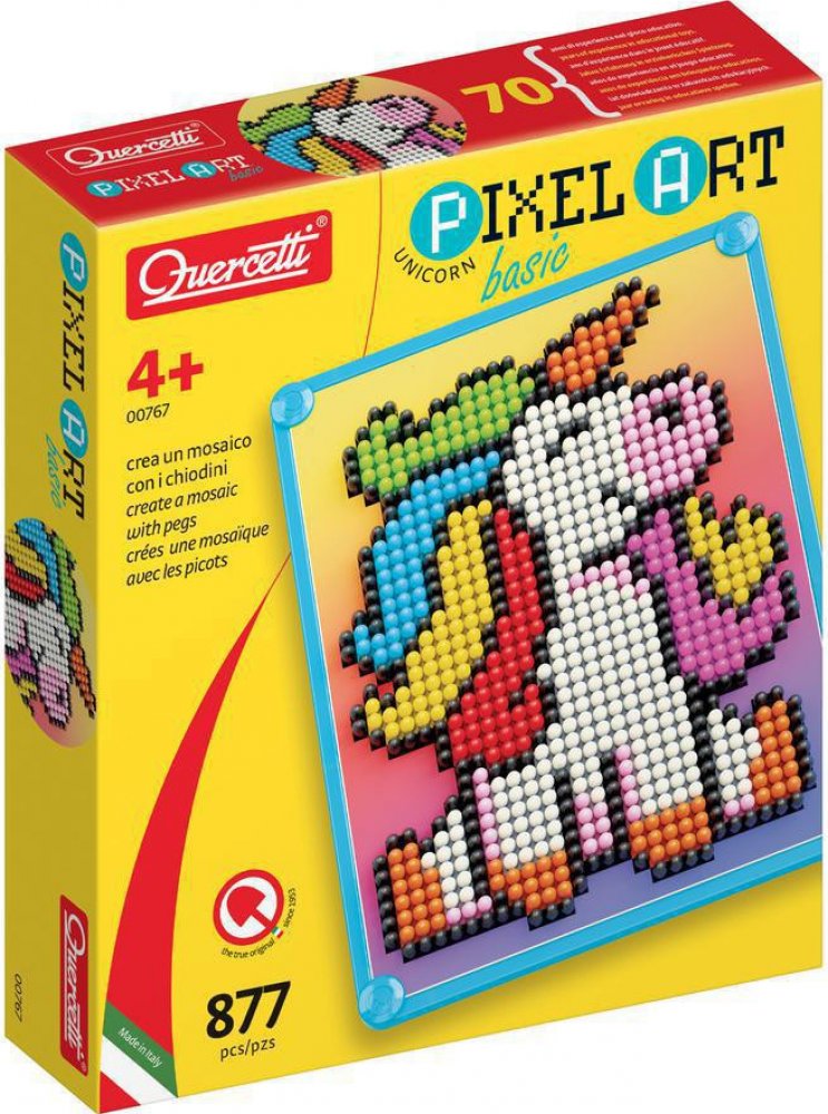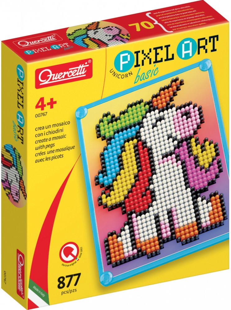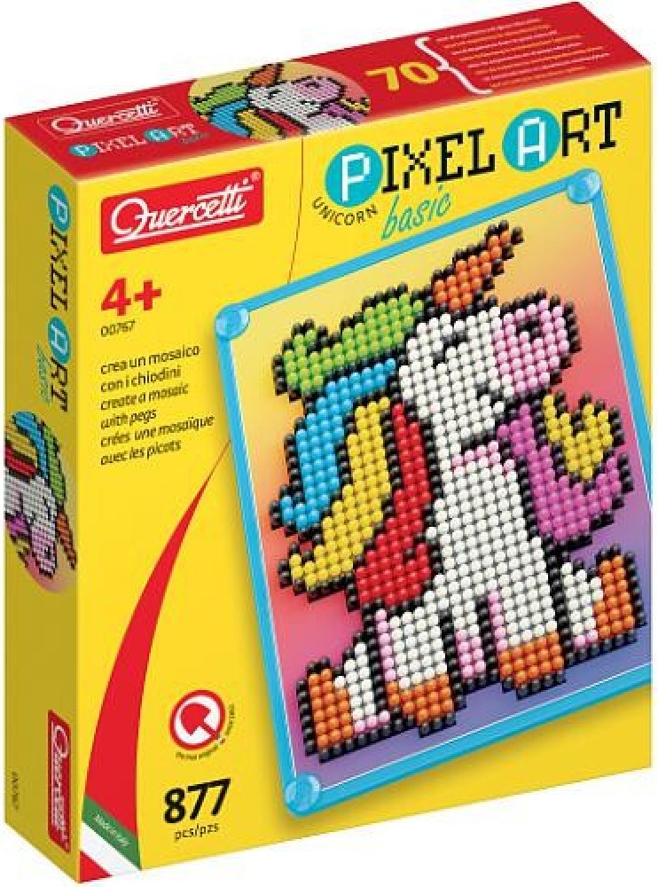 Quercetti 00767 Pixel Art Basic - Jednorožec, Vytvořte mozaiku pomocí kolíčků! Fantastické mozaiky s rámečky k sestavení pomocí kolíčků. Tato hračka pomáhá podporovat koncentraci.