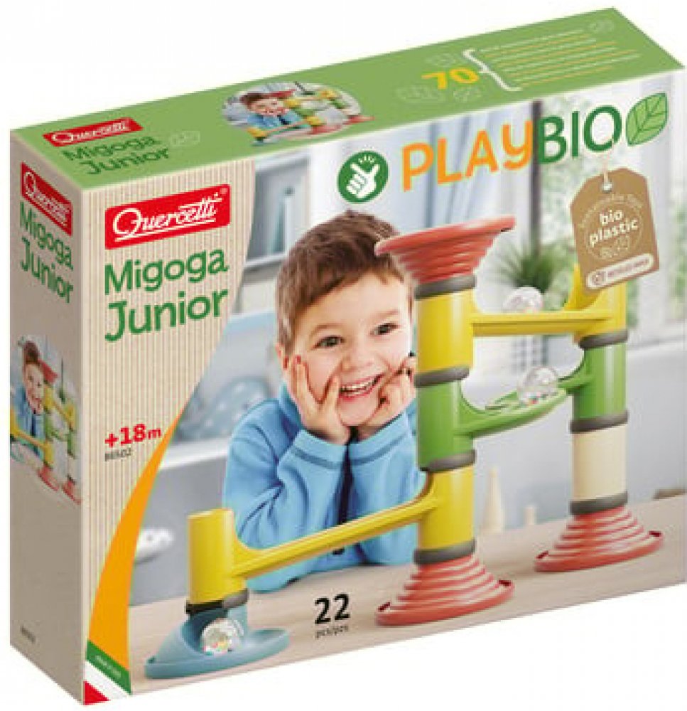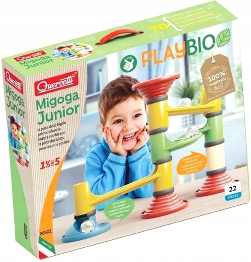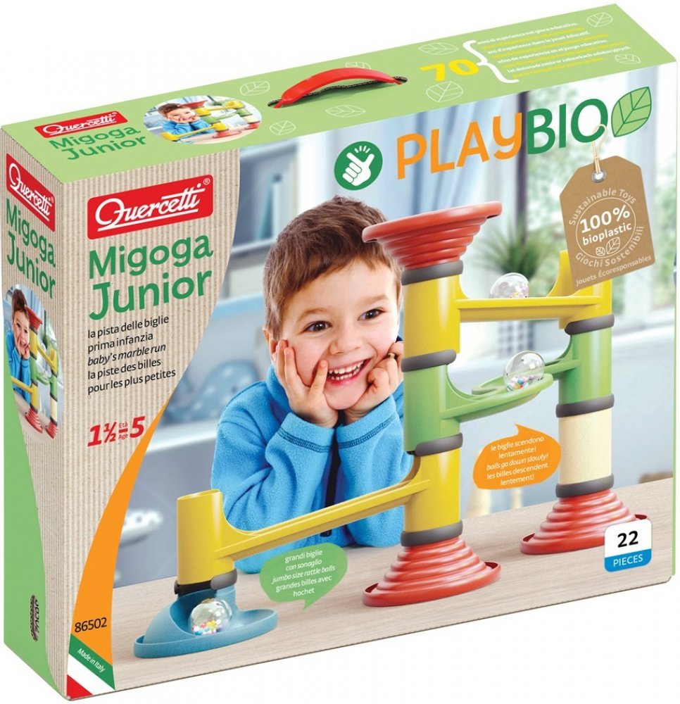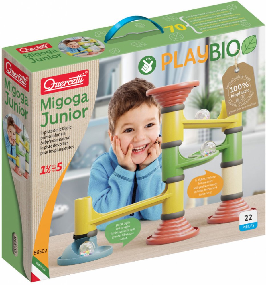Díky stavebnici Migoga Junior si i menší děti mohou hrát s kuličkovou dráhou, která byla vytvořena speciálně pro ně. Všechny díly stavebnice jsou veliké a mají různé barvy, aby se daly od sebe snadno rozeznat. Spojení jsou snadná a intuitivní, což umožňuje rychle postavit různé dráhy. Vyrobeno z udržitelných a 100% recyklovatelných materiálů v sérii PlayBio. Vhodné pro děti od 18 měsíců. BIO PLAST OD SPOLEČNOSTI QUERCETTI.Jaké jsou výhody bioplastů? Jak se získává? Řada hraček Quercetti PlayBio je vyrobena z inovativní biosložky z dřevěných vláken a plastu. Tato volba výrazně snižuje emise CO2 při výrobě. Použité dřevo pochází z udržitelných certifikovaných lesů. Hračka z tohoto bioplastu je odolná, příjemná na dotek i na pohled a také na čich: cítíte nezaměnitelnou vůni dřeva. Když je třeba jej zlikvidovat, lze jej 100% recyklovat. Obsah balení: 2 přímé dráhy1 S dráha3 stojánky1 sběrný stojánek na kuličky3 velké chrastící kuličky Hlavní vlastnosti: zvuková hračkakoordinaci ruka-okorozvíjí zručnost a smysly dětíkreativní myšlení