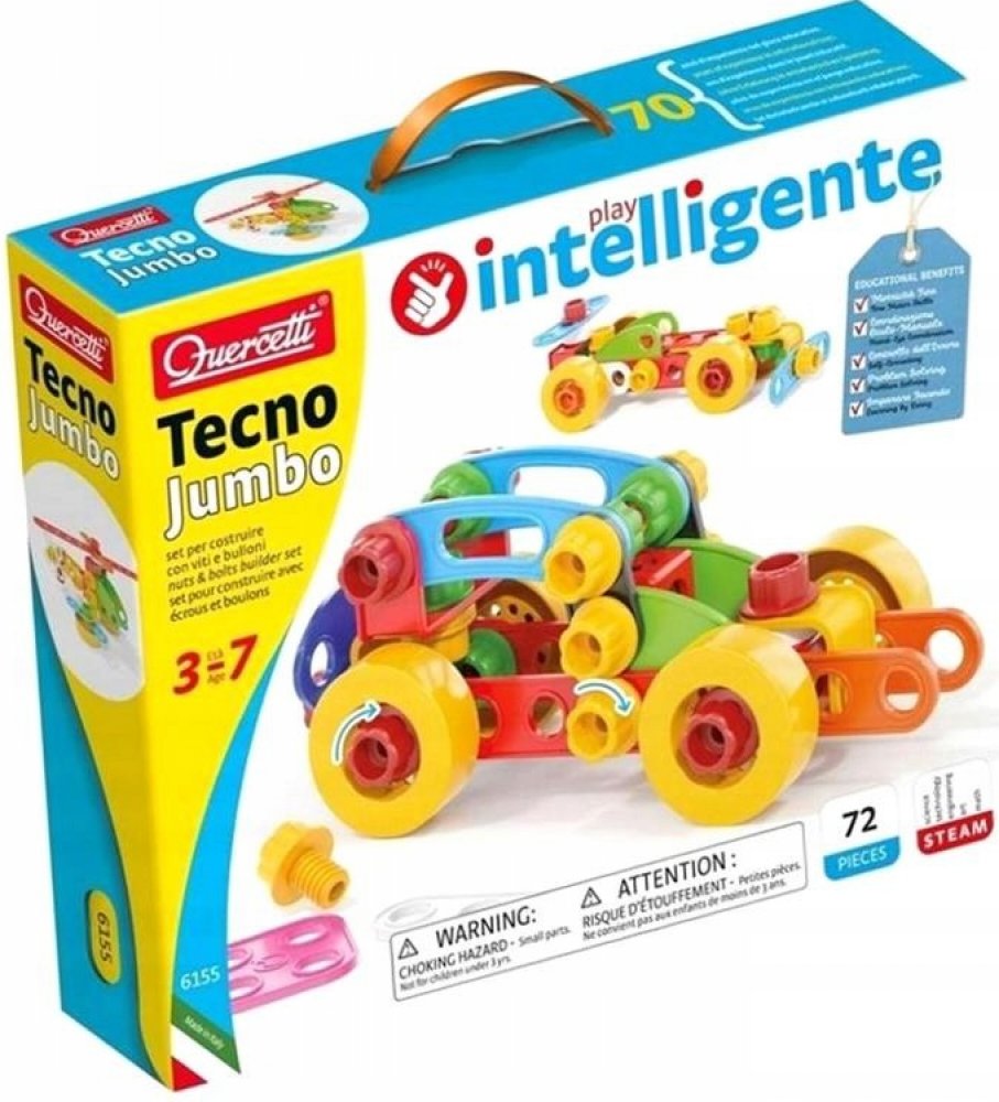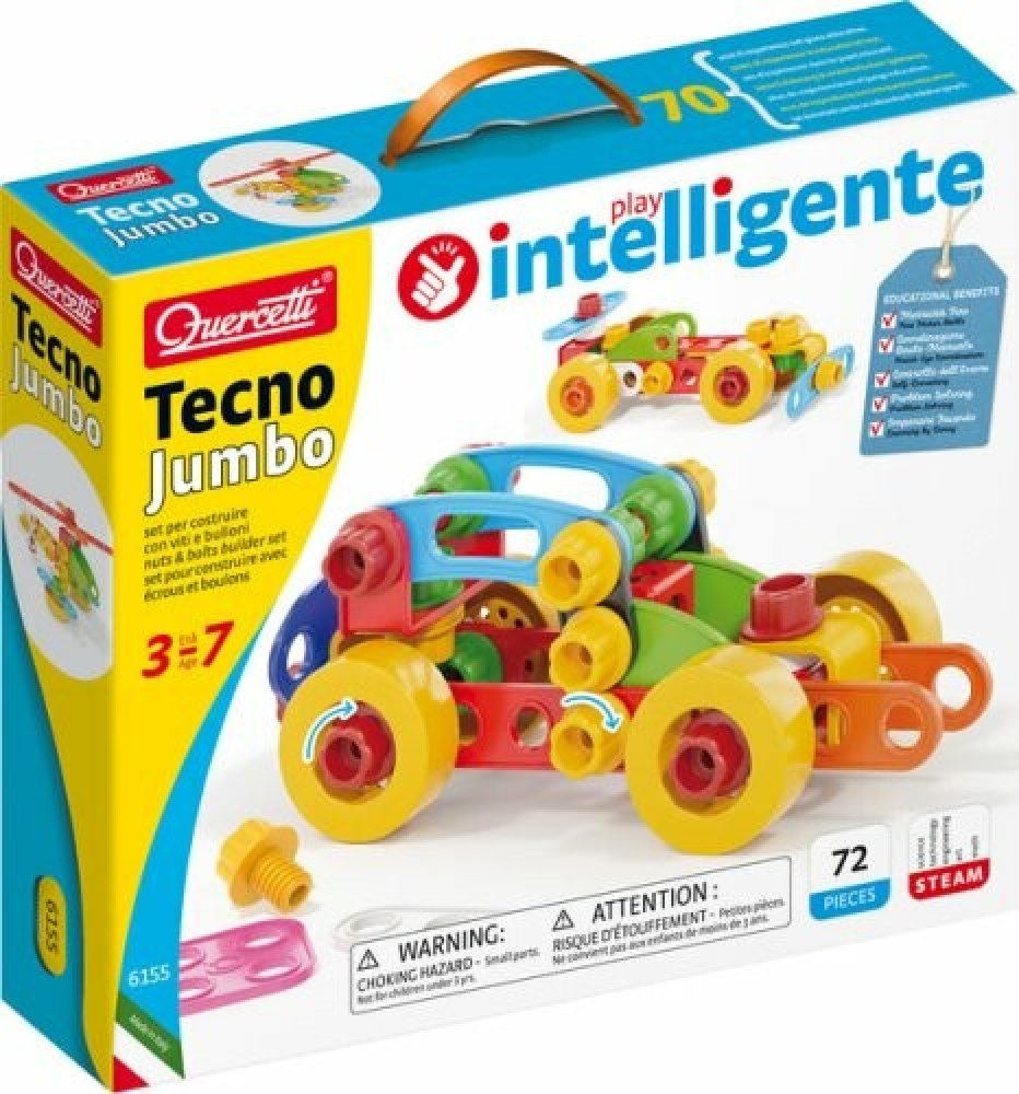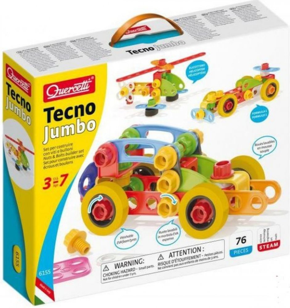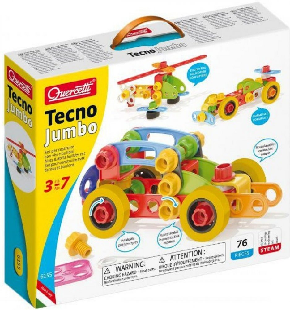 Šrouby, matice, křídlové matice, kola a perforované dílce z odolného, netříštivého plastu je možné sestavovat bez použití jakéhokoli nářadí. Děti budou potřebovat jen své ruce a představivost. Tato sada totiž obsahuje všechno, co je nezbytné k sestrojení aut, helikoptér, jeřábů nebo dalších strojů, které jim přijdou na mysl. Stavebnice Tecno Jumbo rozvíjí koordinaci, logické myšlení i tvořivost a ...