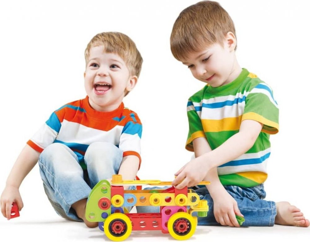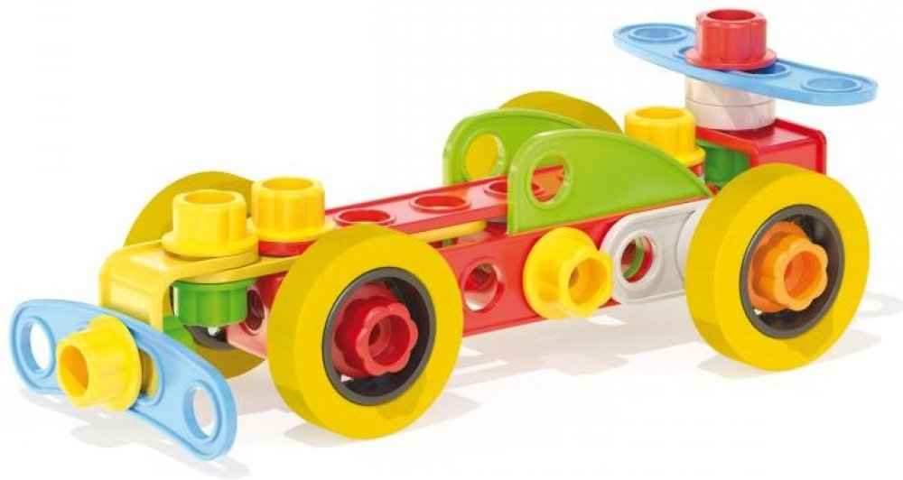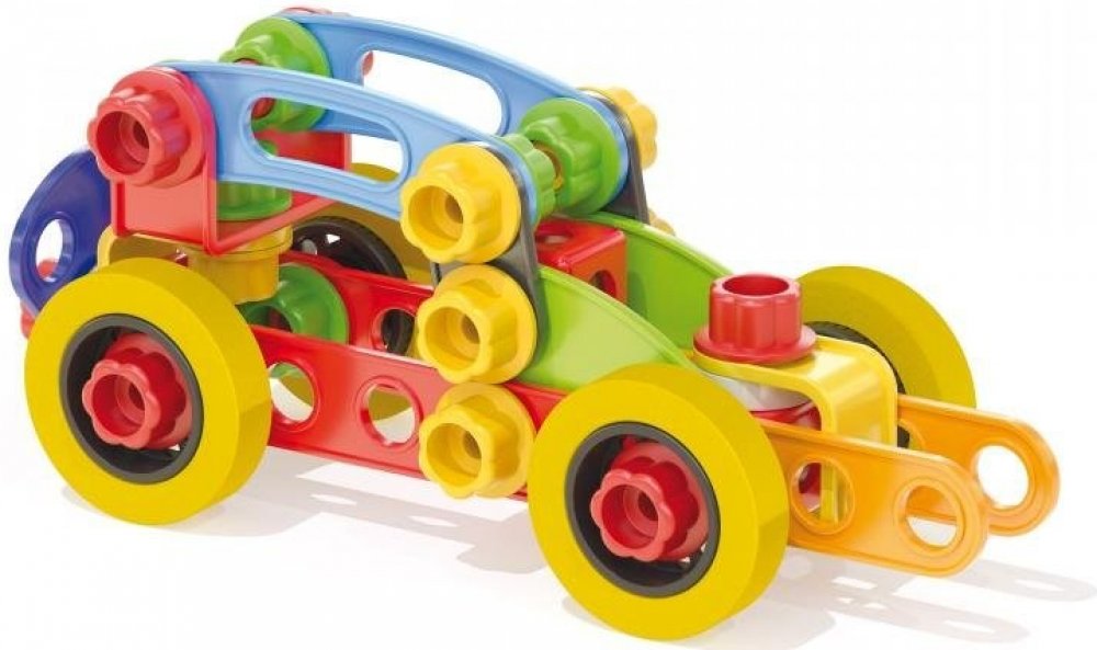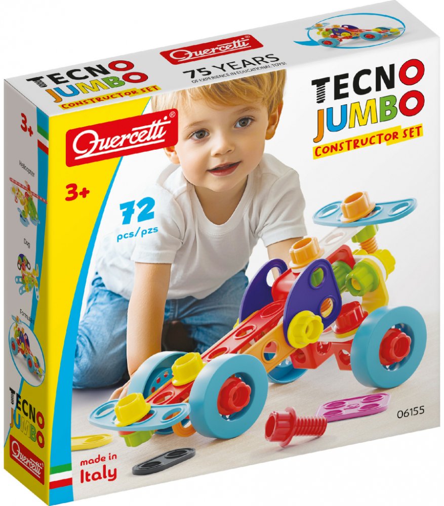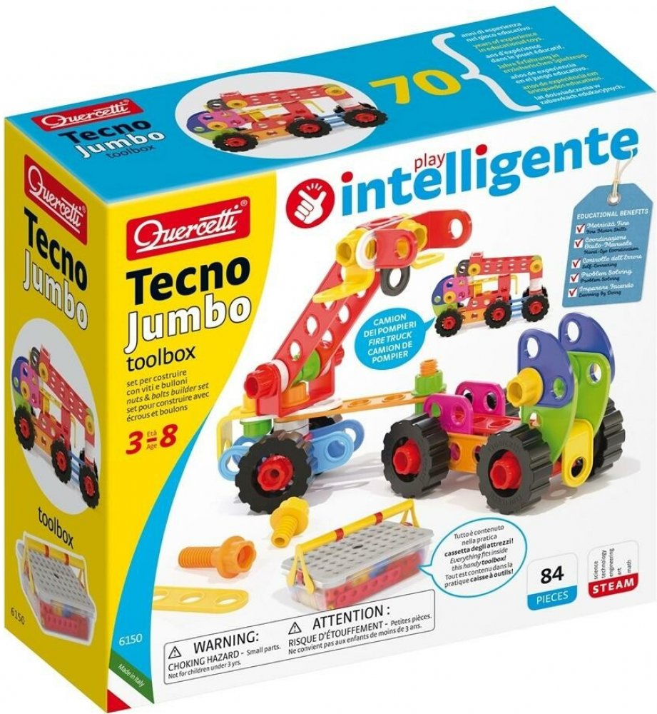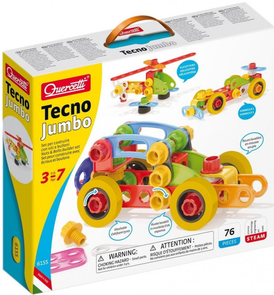 Šrouby, matice, křídlové matice, kola a perforované dílce z odolného, netříštivého plastu je možné sestavovat bez použití jakéhokoli nářadí. Děti budou potřebovat jen své ruce a představivost. Tato sada totiž obsahuje všechno, co je nezbytné k sestrojení aut, helikoptér, jeřábů nebo dalších strojů, které jim přijdou na mysl. Stavebnice Tecno Jumbo rozvíjí koordinaci, logické myšlení i tvořivost a ...