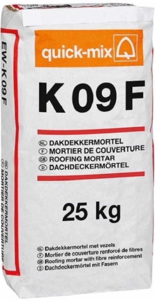Quick-mix K 09F je pokrývačská hydrofobizovaná malta s minerálními vlákny. Použití Pro pokrývačské práce např. k osazování hřebenáčů, nároží, podmazávání tašek aj. Vlastnosti zrnitost 0-1,2 mm, pevnost v tlaku min. 2,5 N/mm2, vydatnost 26 l/40 kg, spotřeba 15-20 kg/1 bm krytiny (od závislosti na profilu krytiny). Výhody zvýšená těsnicí schopnost, Balení v 25kg pytlech, 48 ks/paleta: 1200 kg