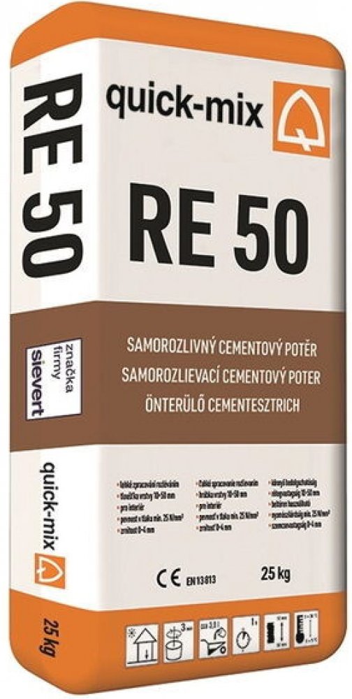 Samovolně roztékavý vyrovnávací a renovační betonový potěr Quick-Mix RE 50 CT C25 F4. Použití pro aplikaci v rozmezí vrstev 10-50 mm v jednom pracovním kroku pouze ve vnitřním prostředí Vlastnosti zrnitost 0-4 mm pevnost v tlaku min. 20 N/mm2 množství záměsové vody 3,5 l / 25 kg vydatnost cca 14 l z 25 kg spotřeba cca 1,8 kg/m2 /mm vrstvy Výhody pochozí po 1 dni možnost následných prací po 1 dni B...