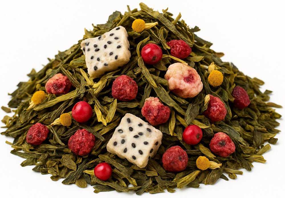 63 % zelený čaj, 8 % oolong, dračí ovoce (kousky), bílý čaj, žlutý čaj, přírodní aroma, růžový pepř (celá jádra), maliny, ostružiny, květy heřmánku, vanilka