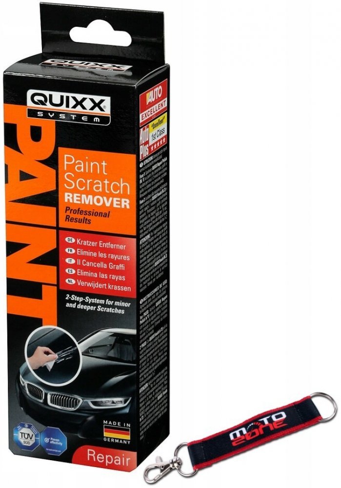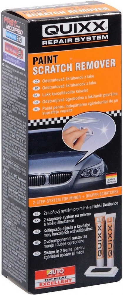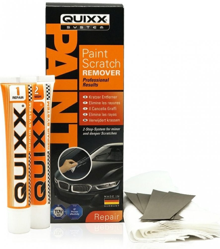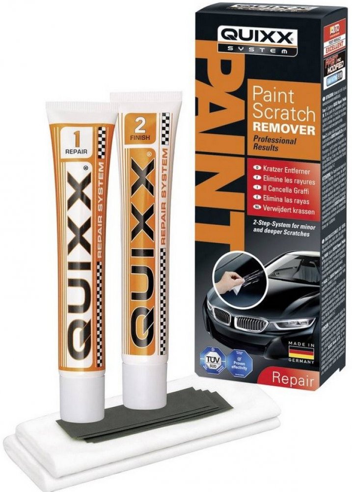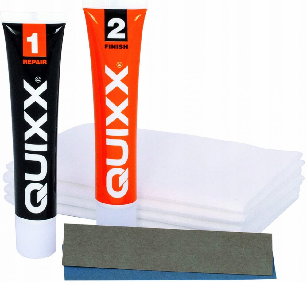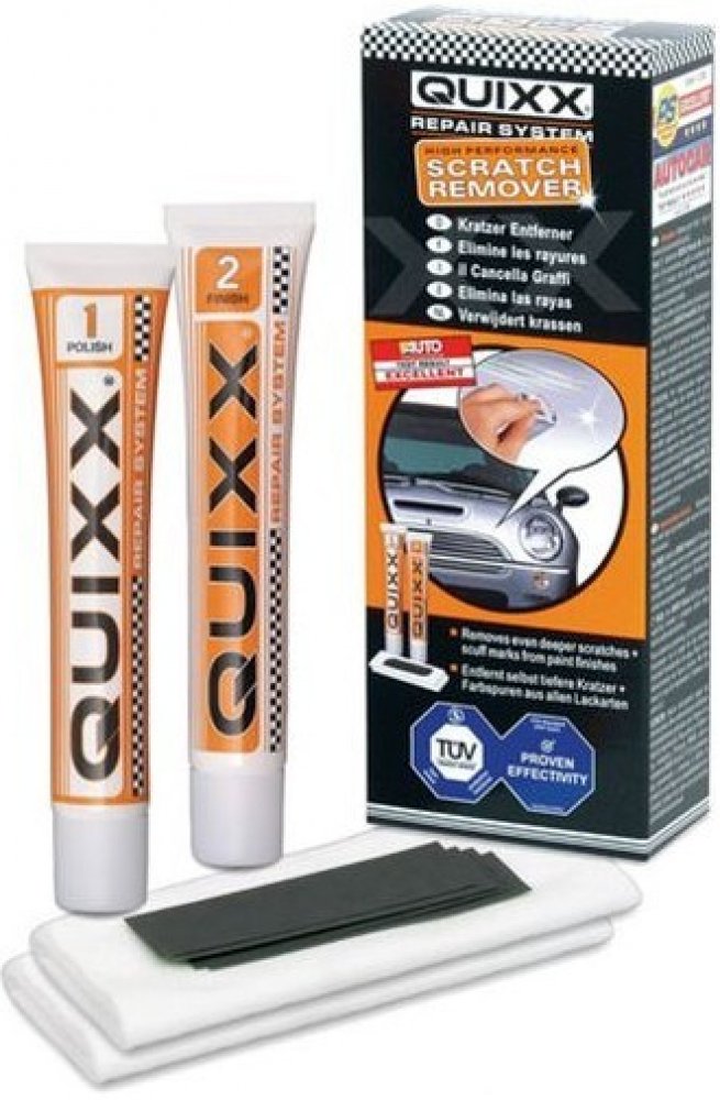 Tato souprava je vhodná na klasický lak stejně tak, jako na lak metalický. Opravárenský systém QUIXX testovaný podle normy TÜV odstraňuje rychle a spolehlivě škrábance, menší rýhy a stopy barev z laků (i s metalízou). Použitelný např. na automobily, motocykly, karavany, čluny atd. Dvě různé speciální politury dokáží odstranit jak mělké, tak i hlubší rýhy. Jednoduše naneste pastu a lak vyleštěte. Díky silnému účinku QUIXX zazáří lak novým leskem.
