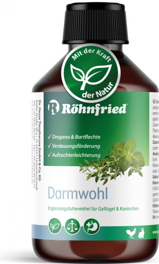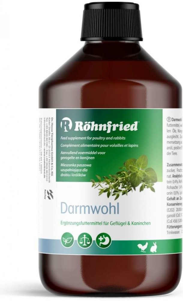 Darmwohl, 500 mlPodpora trávení a imunity u králíků, hlodavců a drůbeže. Usnadňuje odchov a výměnu srsti, snižuje stres a ztráty při chovuPřírodní složení: oregánový a tymiánový olejSnadné použití – přidejte do pitné vody (3 ml / 1 l) 2–3× týdně. Lze kombinovat s přípravky jako pH-Optimal nebo Darmfit. Oblíbené zejména při odchovu, línání a přípravě na výstavy.Složení: voda, hroznový cukr, fruktóza, oregánový a tymiánový olej.Skladování: Uchovávejte těsně uzavřené, mimo světlo.