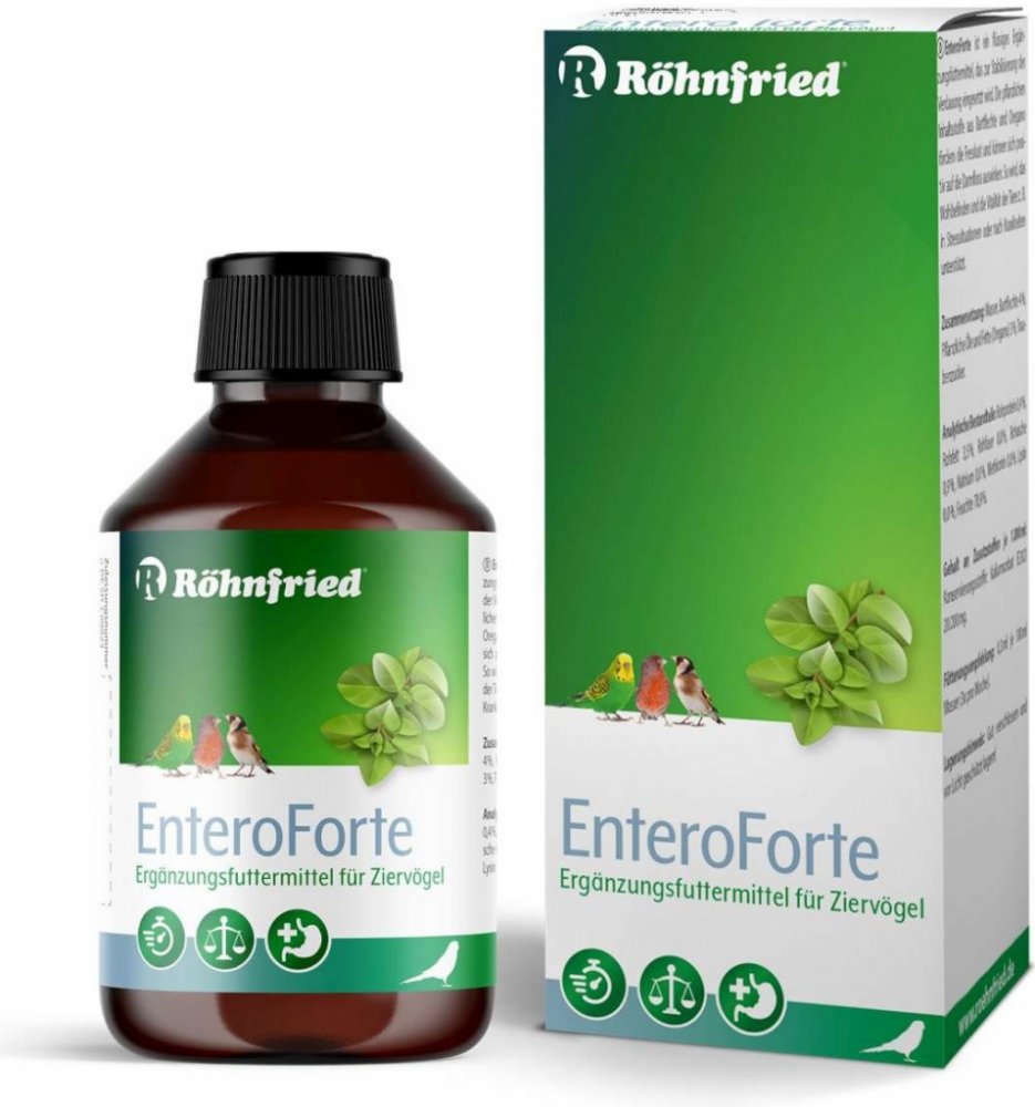 EnteroForte je tekutý doplněk krmiva pro okrasné exotické ptactvo, který se používá ke stabilizaci trávení. Bylinné přísady z lišejníku Usnea Barbata a Oregána podporuje chuť k jídlu a mají pozitivní vliv na střevní flóru. Zdravá střeva jsou zárukou spokojených a zdravých zvířat. EnteroForte je ideální používat ve stresových situacích, po nemoci nebo jako doplněk krmiva během roku.