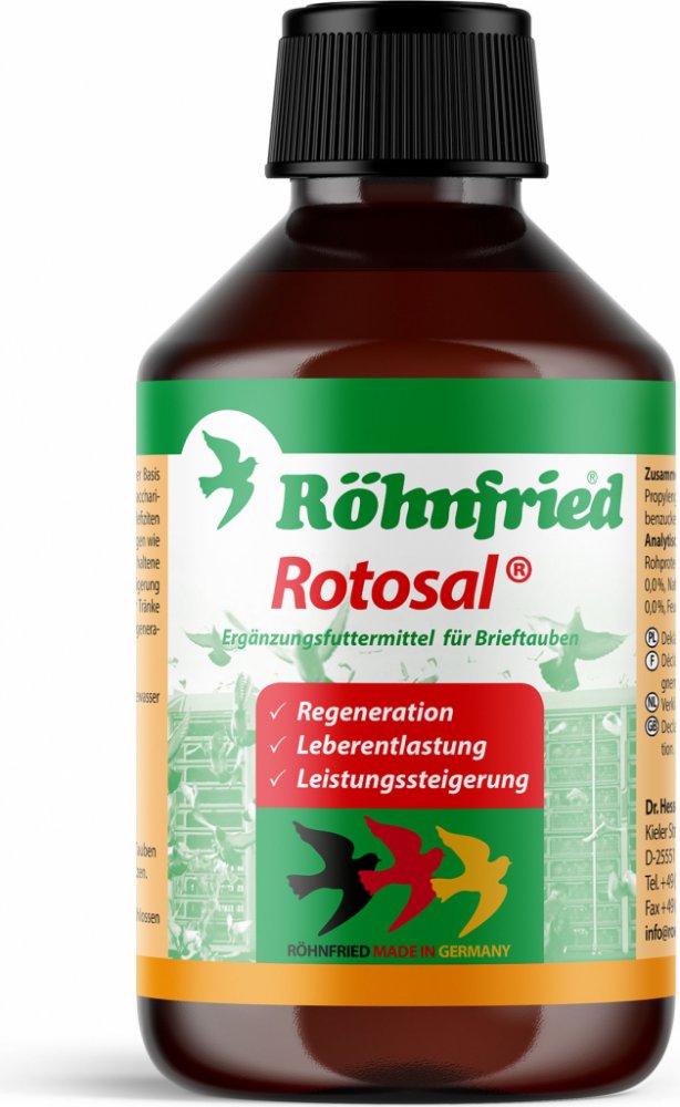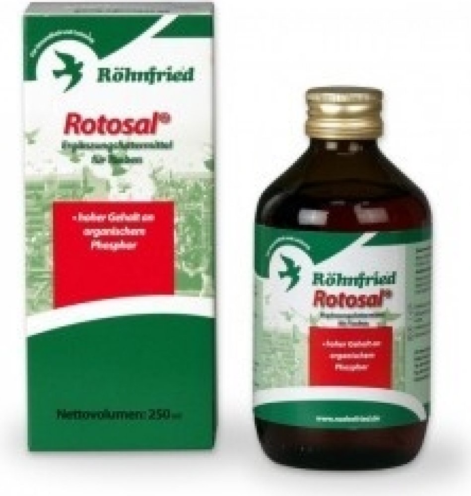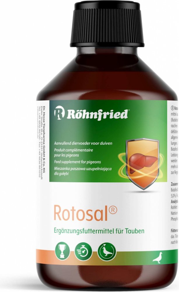 plísněním nebo chovem. Butafosfát obsažený v tomto produktu uvolňuje játra, což má za následek lepší tělesnou výkonnost letů, a tím i lepší letové výsledky. Rotosal podávaný v kontejnerech neztrácí svoji účinnost až 8 hodin. Používá se především k urychlení regenerace.
