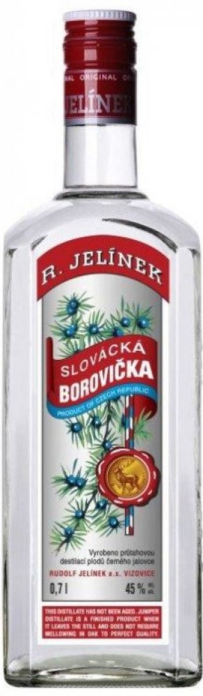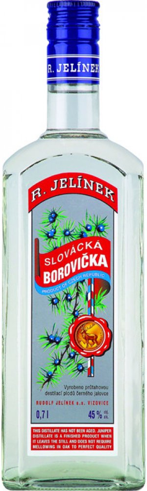 Slovácká borovička 0,7 l Rudolf Jelínek - Tradiční výrobek firmy RUDOLF JELÍNEK a.s. se ve Vizovicích vyrábí nepřetržitě už více než 100 let, s názvem Slovácká borovička 75 let. Specifickou chuť i vůni získává opakovanou destilací vyzrálého černého jalovce spolu s velejemným lihem. Borovičkový destilát necháváme uležet minimálně půl roku před plněním do lahví za účelem sladění, vyváženosti a zjemnění chuti. Slovácká borovička je určena ke konzumaci buďto samotná, vychlazená, nebo do všech druhů koktejlů. Jsou jí přisuzovány blahodárné účinky na trávení.