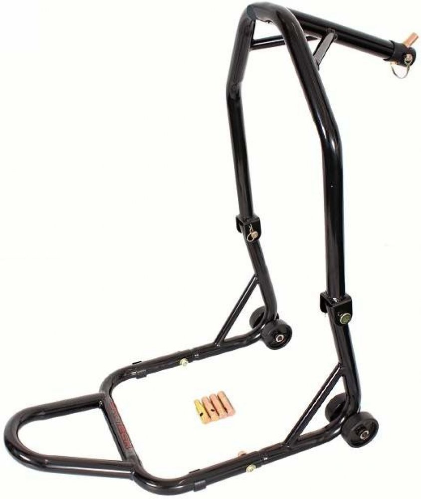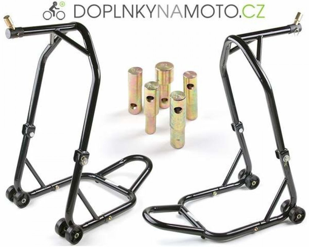 Přední motostojan s kolečky použitelný pod krk řízení motocyklu.Vyroben z robustního ocelového materiálu.Dodává se s pěti typy trnů pod krk řízení ve velikostech: 13mm, 15mm, 16,5mm, 17mm a 18mm.Tento stojan nabízí maximální přístup k přední části motocyklu např. při výměně předního kola či vidlic.Maximální nosnost: 160 kg.Barva: černá.