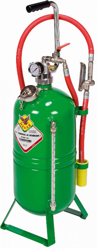 Vhodné pro oleje s vyšší viskozitou. Při naplnění nádoby max. do 4/5 a natlakování na 6-7 bar, pracuje samostatně bez nutnosti napojení na rozvod stlačeného vzduchu. Vhodné pro plnění motorů, převodovek, diferenciálů, hydraulických systémů atd. Nádoba je vybavena stavoznakem pro kontrolu množství kapaliny v nádobě.