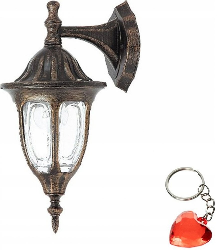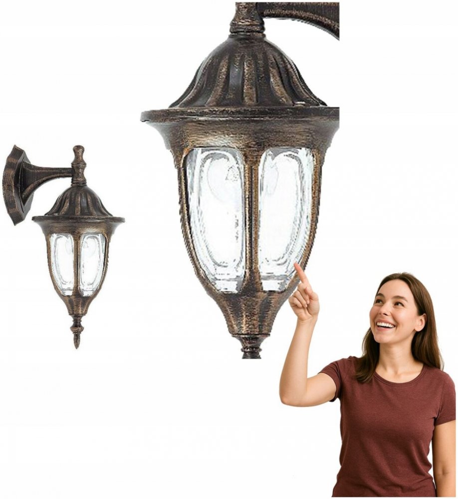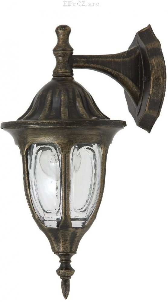 Venkovní nástěnné svítidlo. Konstrukce svítidla je z litého hliníku, stínidlo svítidla je skleněné, čiré. Povrchová úprava svítida je v antickém zlatém provedení. V sérii svítidel jsou nástěnná svítidla, závěsná světla, stropní svítidla a stojanové lampy. Krytí svítidel je IP43, jako zdroj světla doporučujeme použít LED žárovky. Použití: venkovní, nástěnné svítidlo pro osvětlení domu, zahrady, cha...