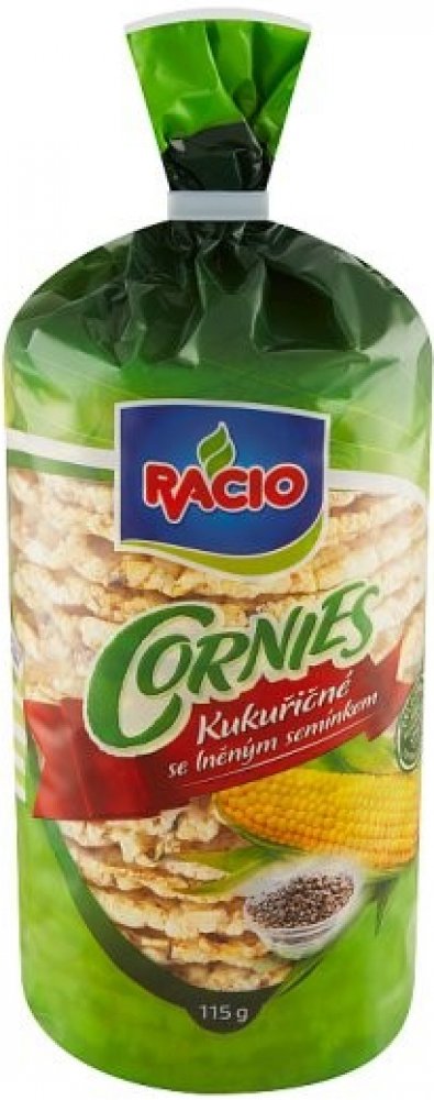 Výborné kukuřičné chlebíčky s přídavkem lněného semínka a špetkou mořské soli vyrobené značkou Racio. Výrobek je pufovaný, což znamená, že se během výroby nafoukne a získá extra křehkost. Výrobek je bezlepkový a veganský. Skladování Uchovejte v suchu, mimo přímé sluneční záření. Složení Kukuřice (95,5 %), lněné semínko (4 %), mořská sůl (0,5 %).