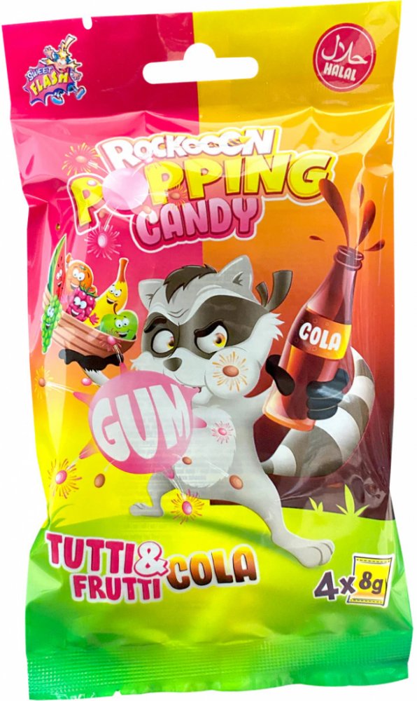 Práskací bonbony se žvýkačkou s příchutí Cola a Tutti FruttiObsah balení: 4 balení po 8 gramechSložení: cukr, glukózový sirup, gumová báze, dextróza, laktóza, kyselina citronová, kyselina jablečná, zvlhčující látka: E420, glycerin; aromata, oxid uhličitý, emulgátor: sójovýlecitin; antioxidant: E321, barviva: E150a, E160a.