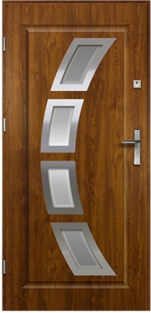 Dveře o tloušťce 55 mm jsou vyrobeny z ocelového plechu potaženého dekorativní fólií odolnou proti UV záření se strukturou a barvou dřeva (případně v barevném provedení).Výplň dveří tvoří deska z pěnového polystyrenu. Dveře jsou vybaveny dvěma nezávislými tříbodovými zámky, třemi nastavitelnými panty a čepy proti vypáčení a vylomení. Mají také těsnění v rámu a prahu.