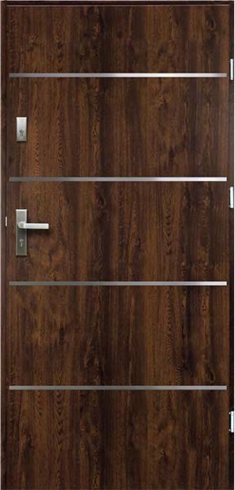 Dveře o tloušťce 55 mm jsou vyrobeny z ocelového plechu potaženého dekorativní fólií odolnou proti UV záření se strukturou a barvou dřeva (případně v barevném provedení).Výplň dveří tvoří deska z pěnového polystyrenu. Dveře jsou vybaveny dvěma nezávislými tříbodovými zámky, třemi nastavitelnými panty a čepy proti vypáčení a vylomení. Mají také těsnění v rámu a prahu.