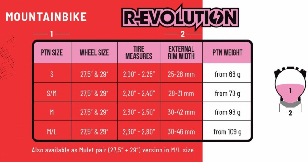 Revoluční dynamická struktura vyvinutá s velkým úsilím a know-how mnohaletého vývoje speciálních vložek do ráfků. Díky speciálnímu tvaru umožňuje přesné usednutí do ráfku a tím perfektně chrání ráfek i plášť. VložkaR-Evolution je určena na všechny MTB disciplíny. Díky možnosti nižších tlaků v pláštích lze dosáhnout lepšího gripu na trailu.- jednoduchá instalace- vyšší ochrana ráfku díky speciálnímu tvaru- stabilní opora pláště- snížení valivého odporu - lepší řízení- kompatibilní se všemi typy tmelů- nízká váha Varianty:S-29": šířka pláště 2.00 - 2.25, šířku ráfku 25-28 mm, hmotnost od 68 g S/M-29": šířka pláště 2.20 - 2.40, šířku ráfku 28-31 mm, hmotnost 78 g M-29": šířka pláště 2.30 - 2.50, šířku ráfku 30-42 mm, hmotnost 98 g M/L-29": šířka pláště 2.30 - 2.80, šířku ráfku 30-46 mm, hmotnost 109 g S-27,5": šířka pláště 2.00 - 2.25, šířku ráfku 25-29 mm, hmotnost 65 g S/M-27,5": šířka pláště 2.20 - 2.40, šířku ráfku 29-35 mm, hmotnost 75 gM-27,5": šířka pláště 2.30 - 2.50, šířku ráfku 29-35 mm, hmotnost 95 gM/L-27,5: šířka pláště 2.30 - 2.80, šířku ráfku 30-46 mm, hmotnost 105 gM-29"/27,5" (mullet): šířka pláště 2.30 - 2.50, šířku ráfku 30-42 mm, hmotnost 109/105 g M/L-29"/27,5" (mullet): šířka pláště 2.30 - 2.80, šířku ráfku 30-46 mm, hmotnost 109/105 g V balení:2x PTN R-Evolution2x ventilek Lufty 2 (47mm)1x sada nálepek PTN1x víceúčelový obal