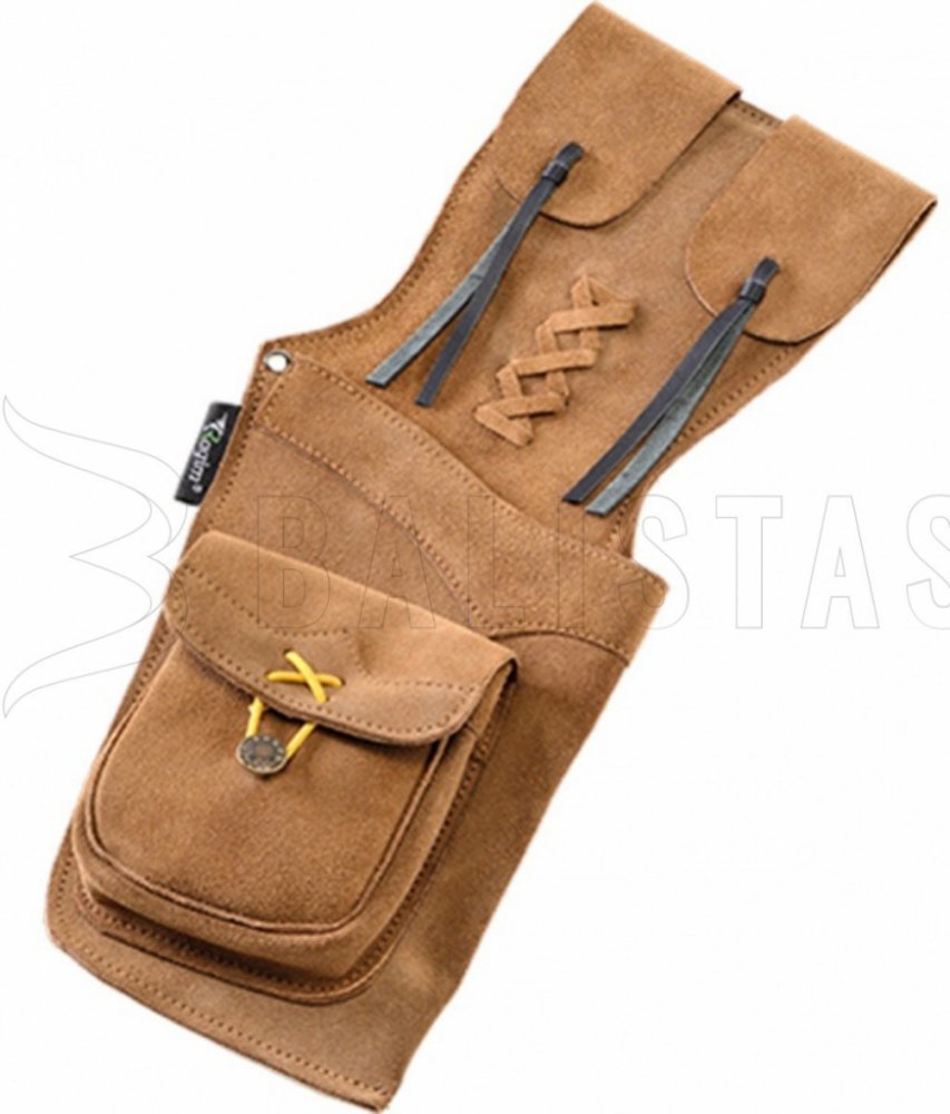 Toulec Ragim A2061 boční, závěsný Toulec na šípy Ragim ze semišové kůže se závěsem a kapsou pro příslušenství, vhodný pro lukostřelce, praváky i leváky, délka toulce 15,5". Baťoh na šípy :-).