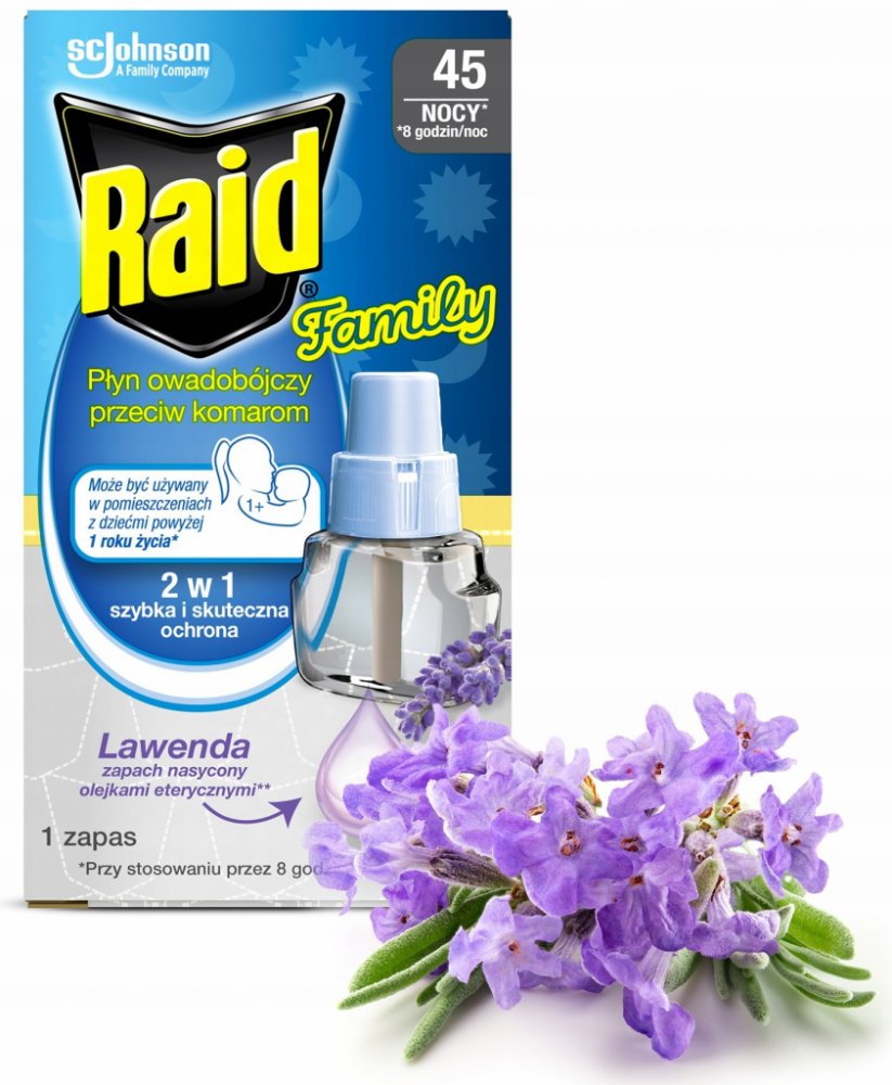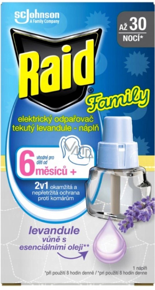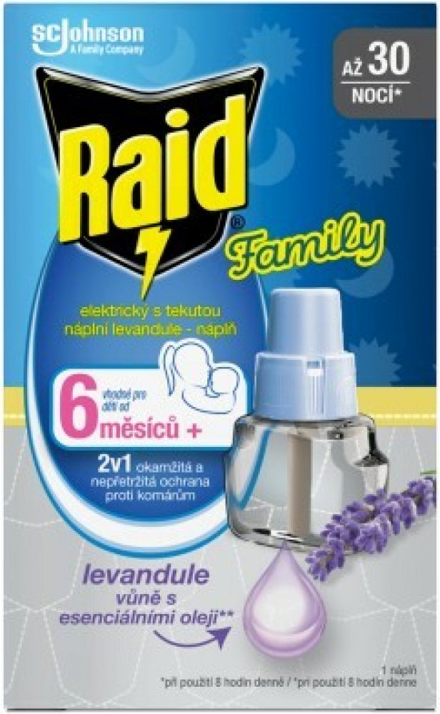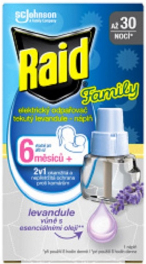 Raid proti komárům je náplň pro elektrický odpařovač s tekutou náplní levandule, insekticid poskytuje efektivní ochranu proti komárům až 45 nocí/8 hodin/noc. Poskytuje nepřetržitou a diskrétní ochranu bez nepříjemného zápachu nebo dýmu.