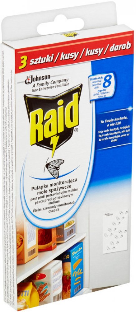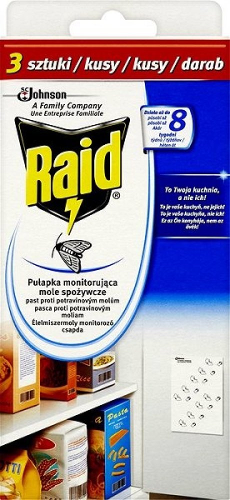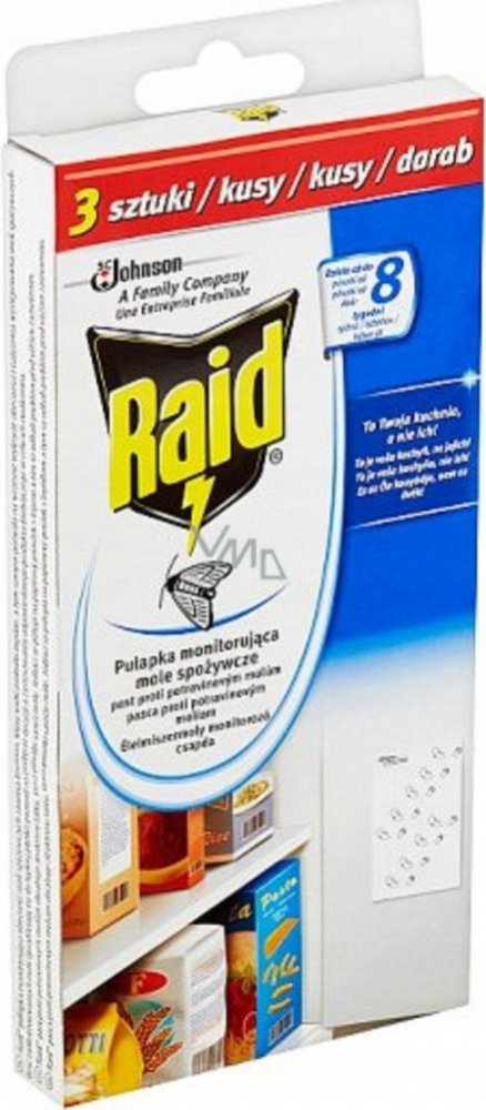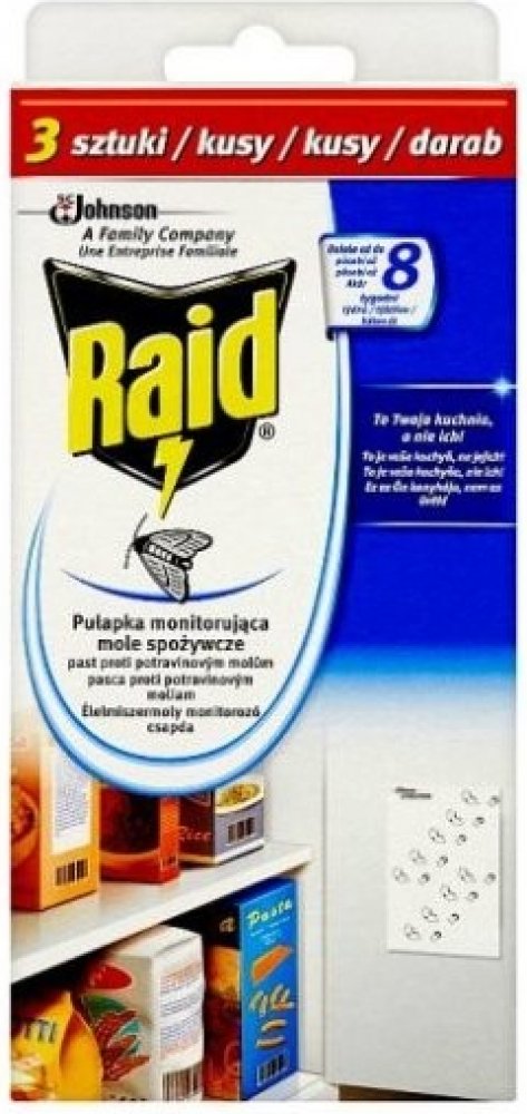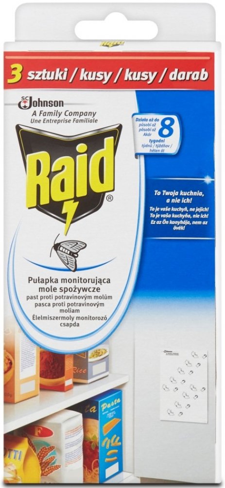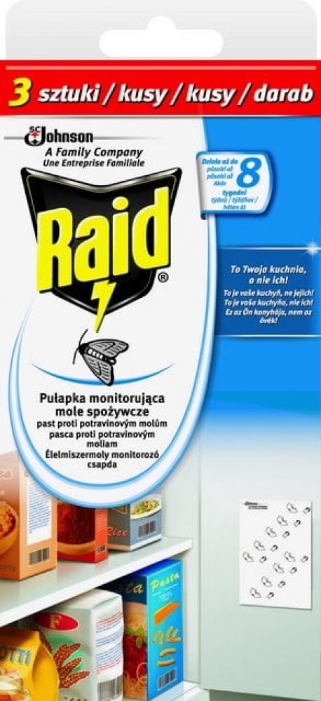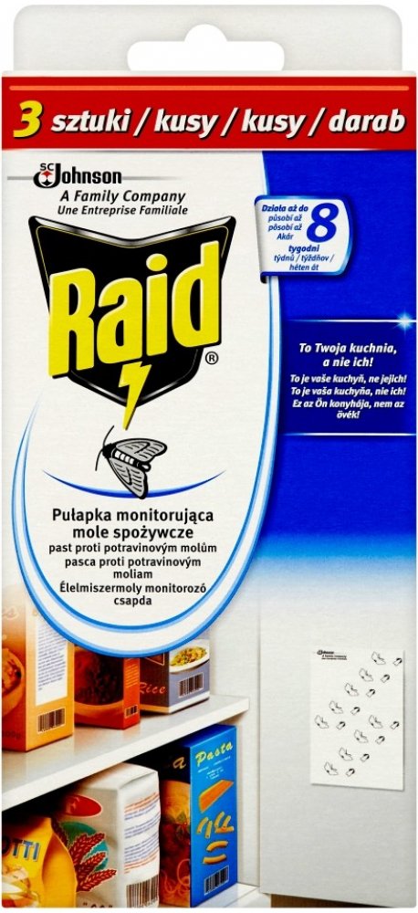 Dejte STOP molům a chraňte své potraviny před těmito škůdci. Odpuzovač Raid obsahuje papírové proužky s lepem, které se umístí do blízkosti potravin. Nástrahy obsahují speciální látku, která přivábí samčí moly a ti se přilepí na proužek, čímž se zastaví jejich reprodukční cyklus.