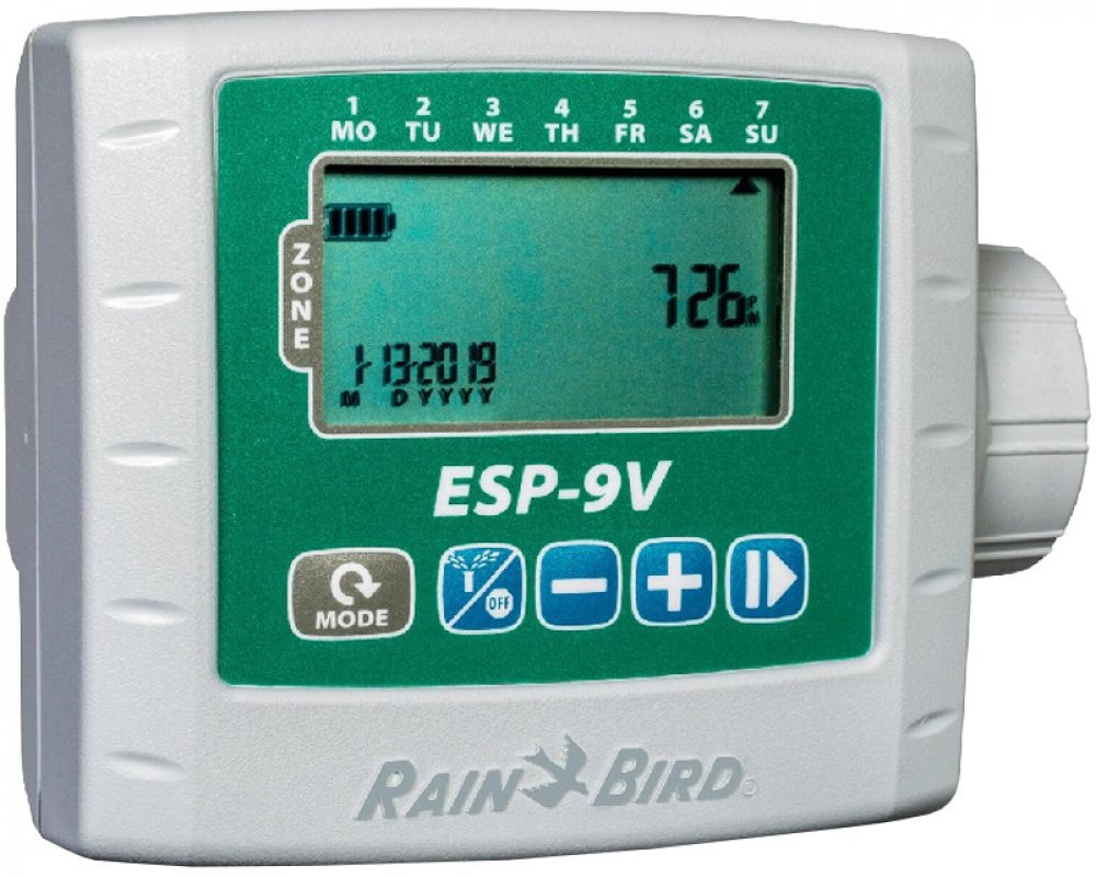 Bateriová řídící jednotka RainBird ESP-9V-4 pro 4 sekceRainBird ESP-9V je špičková bateriová řídící jednotka navržena pro bezproblémové zavlažování. Tato jednotka je ideálním řešením pro systémy, kde není dostupná elektrická energie, ať už pro soukromé zahrady nebo veřejné prostory. S vodotěsným provedením, odpovídajícím normě IP 68, je tato jednotka plně přizpůsobena pro venkovní použití a může být instalována přímo v šachticích u ventilů, kde spolehlivě čelí vlhkosti a náročným podmínkám.RainBird ESP-9V vyniká jednoduchostí ovládání a profesionální výkonností, poskytuje uživatelům snadnou instalaci a minimální údržbu. Její robustní design zajišťuje dlouhodobou spolehlivost a výkon, což z ní dělá efektivní volbu pro každého, kdo hledá odolnou a intuitivní řídící jednotku pro svůj zavlažovací systém. Jednotka je vhodná pro použití do soukromých zahrad i veřejných ploch. Napájení pomocí 2x 9V alkalické baterie (baterie nejsou součástí balení) Disponuje velkým LCD displejem a programovacími ikonami, ovládání je konzistentní s řadou RZX Nabízí větší displej než konkurenční produkty Odolná proti vodě díky membránové klávesnici Různorodé možnosti zavlažovacích programů, snadné tříkrokové nastaveníSpecifikace: 1 Program, 8 startovacích časů Velký LCD displej a programovací ikony Membránová vodotěsná klávesnice Velký výběr zavlažovacích režimů Funkce WATER BUDGET 0-200% Funkce RAIN DELAY vyřadí zavlažování na interval 1-15 dní Obvod pro hlavní ventil/spouštecí relé čerpadla Samostatný vstup pro přímé zapojení čidla srážek RSD-BEX Kompatibilní jen s 9V solenoidem Ochranné krytí IP68 Indikace slabých baterií pracuje se všemi 9V elektroventily max. vzdálenost mezi ovládací jednotkou a 9V cívkou je 30 m při použití vodiče 1,5 mm2Jednotku lze upevnit pomocí držáku na stěnu, nebo může být připevněna na 9V Rain Bird solenoid elektromagnetického ventilu. Balení řídící jednotky neobsahuje baterii.