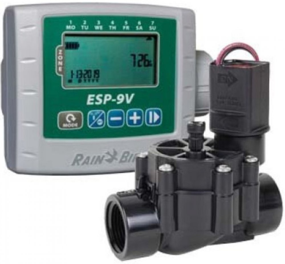 Bateriová řídící jednotka RAIN BIRD ESP-9VI1 s elektroventilem pro ovládání 1 sekce (zóny zavlažování) pro automatické řízení závlahy bez nutnosti přívodu 220 V napětíBateriová řídící jednotka RAIN BIRD ESP-9VI1 s elektroventilem pro ovládání 1 sekce (zóny zavlažování) pro automatické řízení závlahy bez nutnosti přívodu 220 V napětí.Specifikace a výhody:ovládání 1 sekce (zóny)vodotěsné pouzdro zajišťuje dlouhou životnost i při instalaci do ventilové skříňkyprogramovací funkce jsou pohodlně umístěny na jedné obrazovce, díky čemuž je programování rychlé a snadnéprovoz minimálně dva roky se dvěma 9-voltovými alkalickými bateriemi nebo minimálně jeden rok s jednou 9-voltovou alkalickou bateriívelký LCD displej se snadnou navigací v uživatelském rozhraníhlavní ventil/obvod spouštění čerpadla (pouze pro více zónové jednotky)energeticky nezávislá programová paměť udrží zavlažovací plán, když se baterie vybijí nebo se vyměníkrytí IP68 pro ochranu proti prachu a vniknutí vodyplastové pouzdro ovladače s vynikající odolností vůči povětrnostním vlivům, žloutnutí a stárnutídvojitě utěsněná přihrádka na baterie chrání před prachem, špínou a vodouovládat lze pouze elektroventily s 9 V cívkou (napětím)1 ks elektroventil 9 V je součástí baleníFunkce plánování:speciální jednodotykové tlačítko manuálního zavlažování pro snadnou obsluhuautomatické stohování zón zajišťuje, že pouze jeden ventil zavlažuje současně. ESP-9V automaticky zavlaží nejprve zónu s nižším číslem, pokud jsou zóny naplánovány na zavlažování ve stejnou dobu.Contractor Rapid Programming™ automaticky zkopíruje časy začátku a dny zavlažování ze zóny 1 do všech zbývajících zón při úvodním nastavenízavlažovací plány lze vytvořit ve třech jednoduchých krocíchčasy chodu, časy začátku a dny zavlažování jsou přizpůsobitelné podle zóny6 startovacích časů na zónu4 možnosti zavlažovacího dne na zónu: Vlastní dny v týdnu, Cyklické a PÁRNÉ nebo PÁRNÍ kalendářní dnyodložení zavlažování (1 až 9 dní)Rozměry:rozměry: šířka: 13,59 cm x výška: 10,26 cm x hloubka: 6,15 cmhmotnost: 907 gvelikost obrazovky LCD: 5,72 cmVIDEO: