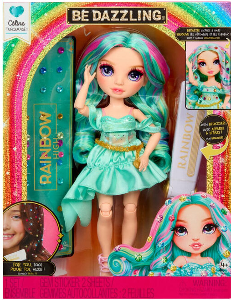 Objevte panenku Rainbow High Be Dazzling Fashion Celine Turquoise, která rozjasní každý den svým nádherným duhovým stylem! S pohyblivými klouby a dlouhými vlasy, které můžeš upravovat, přijde spolu s unikátním outfitem a třpytivými kamínky, které lze jednoduše připevnit pomocí krimpovacího nástroje. Děti od 4 let si tak mohou hrát na módní návrháře a vytvářet vlastní oslnivé účesy i oblečení nejen pro panenku, ale třeba i pro sebe!