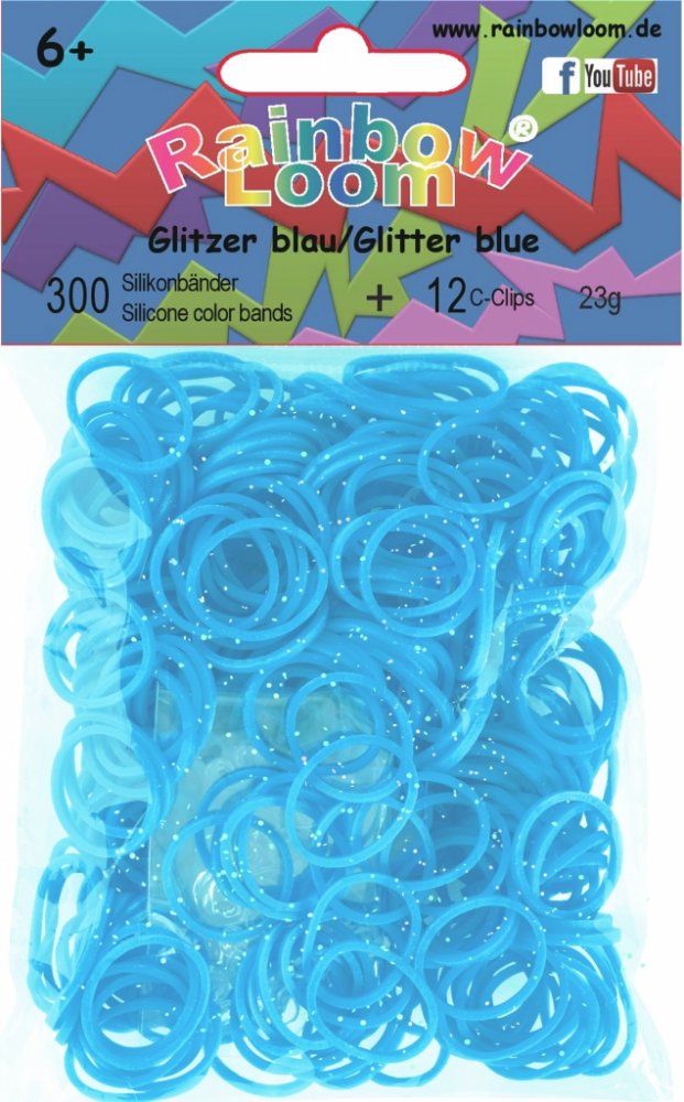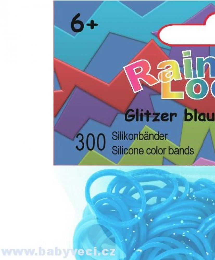 RAINBOW LOOM náhradní gumičky třpytivé jsou 100% silikonové, bezlatexové a jsou vysoce odolné. Balíček obsahuje 300 kusů gumiček třpytivě modrých a 12 kusů "C" svorek. Pro děti od 6 let, umí s nimi pracovat i 5 leté děti.