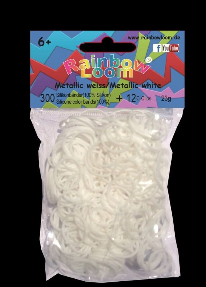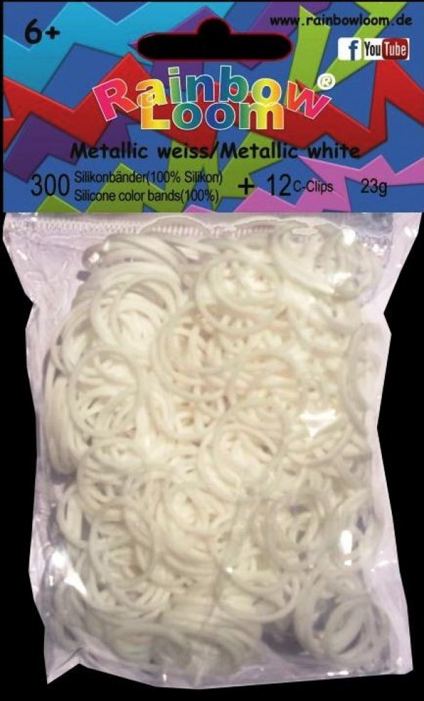 RAINBOW LOOM náhradné gumičky metalízovésú 100% silikónové, bezlatexové a sú vysoko odolné.Balíček obsahuje 300 kusov gumičiek biela metalíza a 12kusov "C" svoriek.Pre deti od 6rokov, vedia s nimi pracovať aj 5 ročné deti.