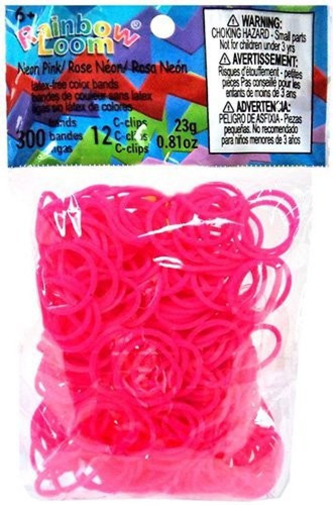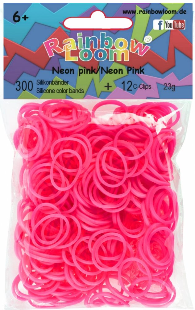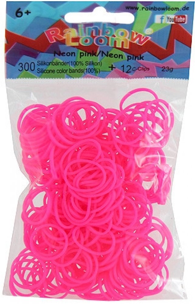 RAINBOW LOOM náhradné gumičky neónové sú 100% silikónové, bezlatexové a sú vysoko odolné. Balíček obsahuje 300 kusov neónovo ružových gumičiek a 12 kusov "C" svoriek. Pre deti od 6 rokov, vedia s nimi pracovať aj 5 ročné deti.