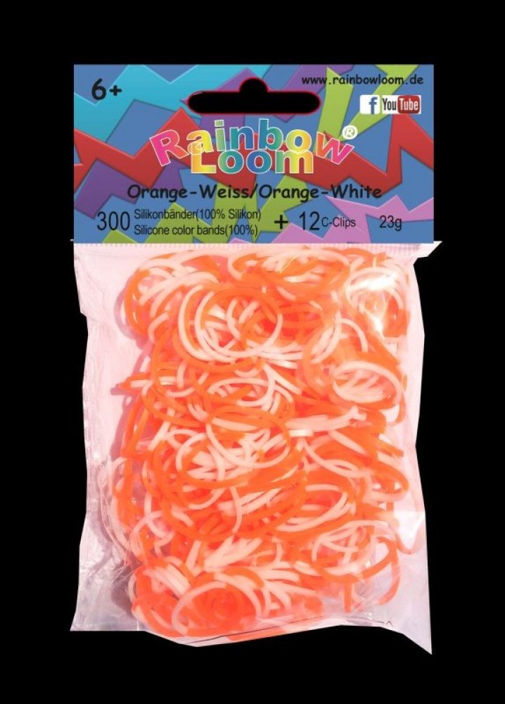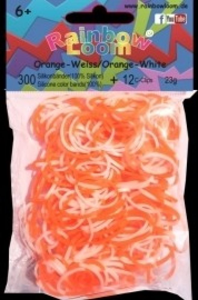RAINBOW LOOM náhradní gumičky dvoubarevné jsou 100% silikonové, bezlatexové a jsou vysoce odolné. Balíček obsahuje 300 kusů gumiček oranžovo-bílých a 12 kusů "C" svorek. Pro děti od 6 let, umí s nimi pracovat i 5 leté děti.