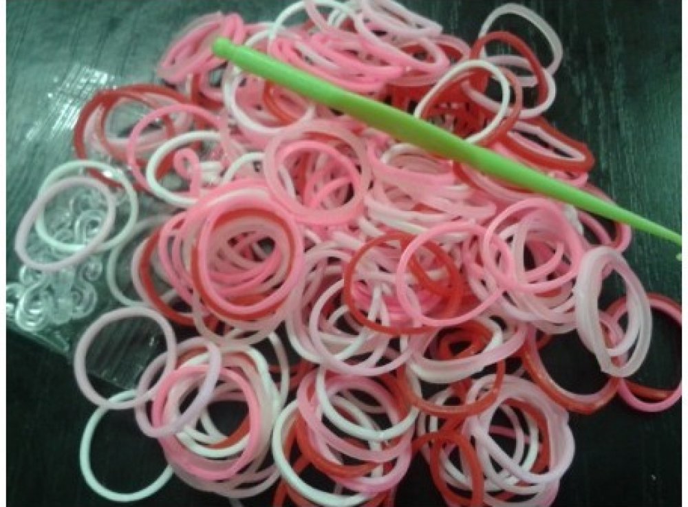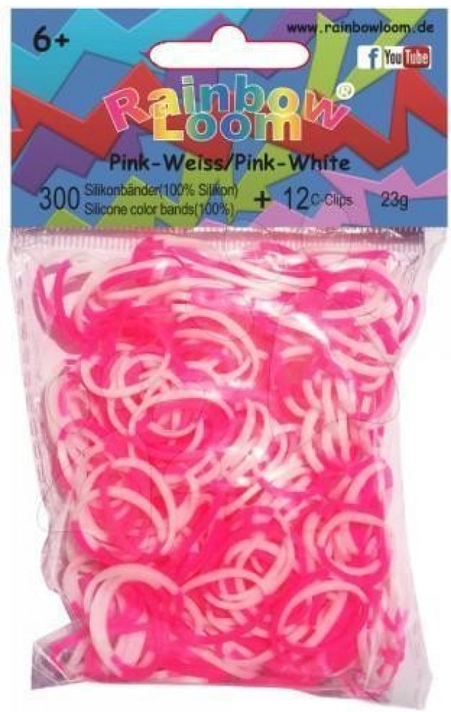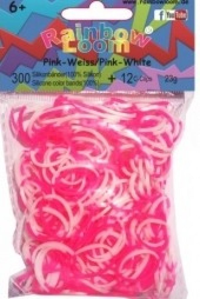 RAINBOW LOOM náhradní gumičky dvoubarevné jsou 100% silikonové, bezlatexové a jsou vysoce odolné. Balíček obsahuje 300 kusů gumiček růžovo-bílých a 12 kusů "C" svorek. Pro děti od 6 let, umí s nimi pracovat i 5 leté děti.
